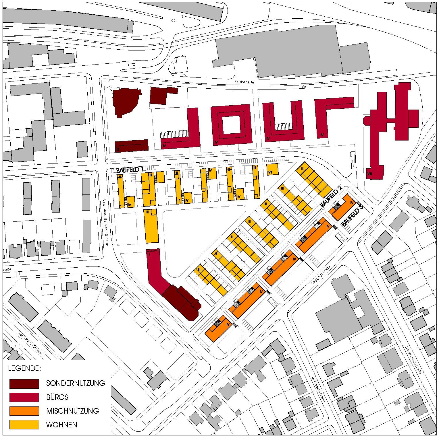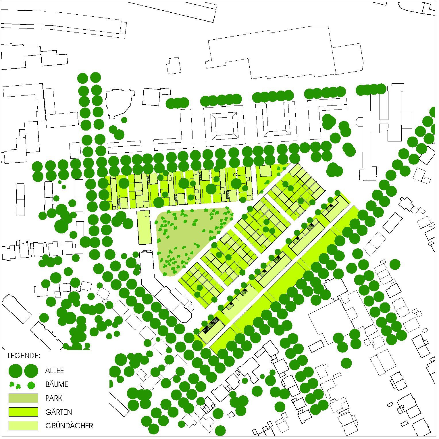 Planungsgebietes, um den sich die Wohnquartiere mit grünen Höfen und Gartenhöfen gruppieren. Die Nutzungen sind im Planungsgebiet ringförmig