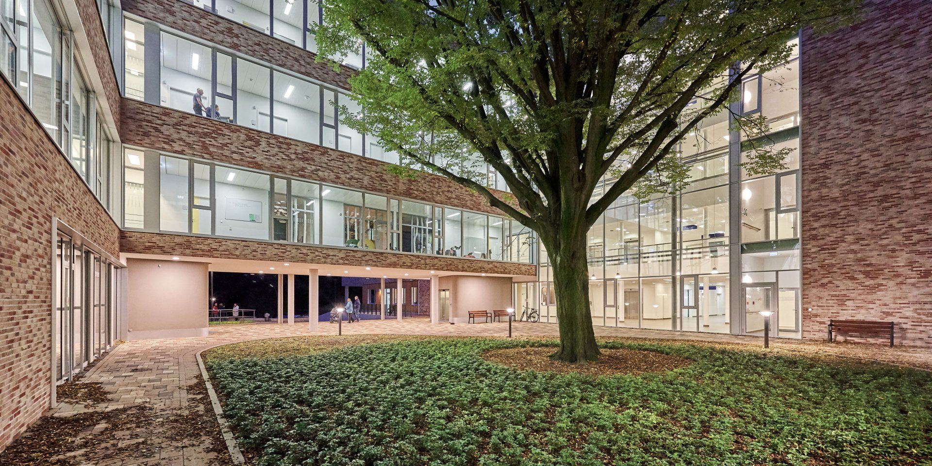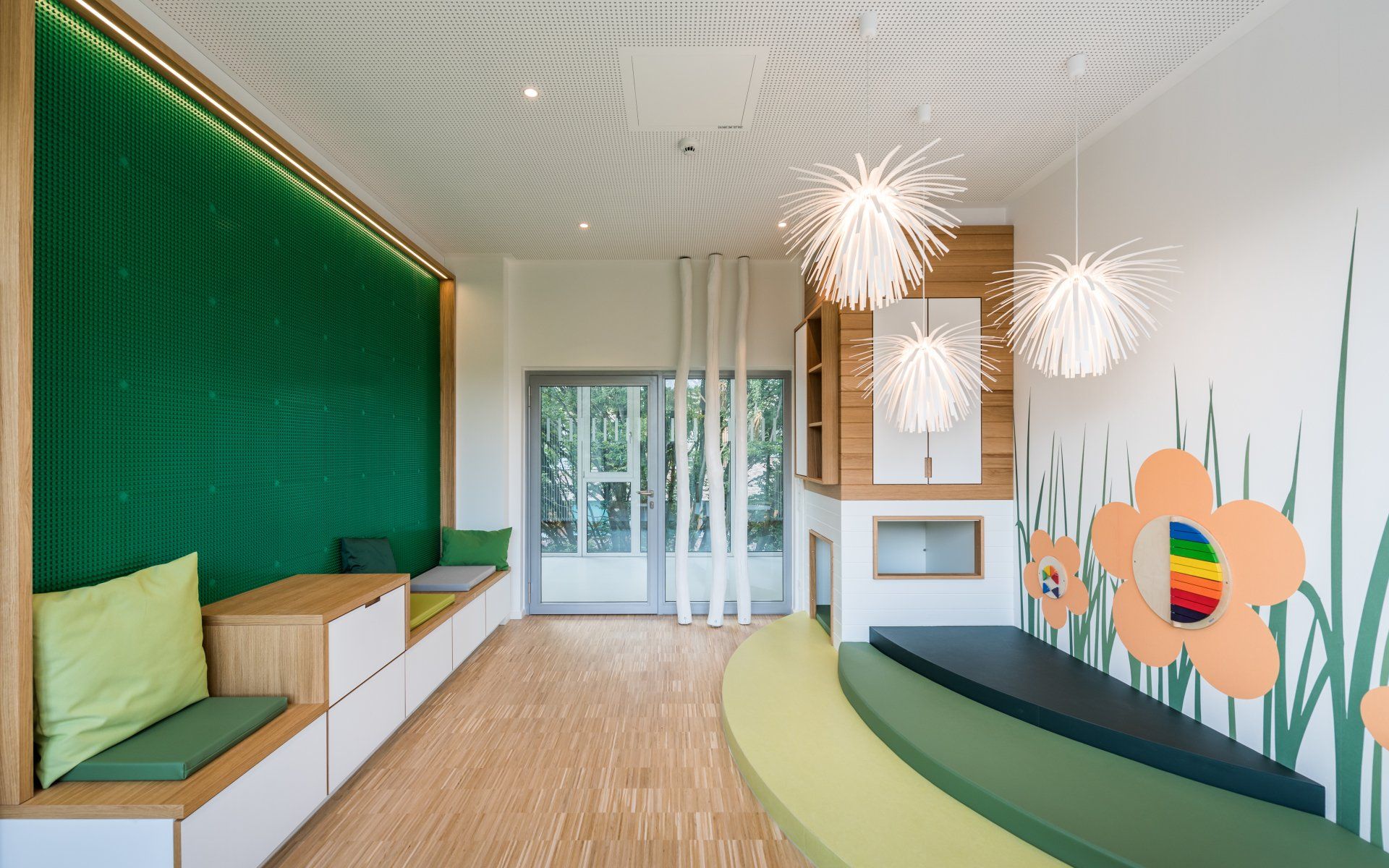 Um diese Buche, die das Leitmotiv für den gesamten Entwurf prägt, fügt sich das Gebäude offen, lichtdurchflutet und großzügig. Neben den hochtechnischen Bereichen hält es immer wieder Nischen bereit, die den „kleinen Patienten“ und Besuchern Geborgenheit bieten und Vertrauen stiften. In diesem besonderen Baumhaus werden so viele Kinder wie möglich nahe an die Natur und den Außenraum gebracht. Überall ist der Freiraum zugänglich und gibt den unterschiedlichen Bedürfnissen und Möglichkeiten der Patienten einen eigenen Raum: auf dem Boden der Höfe, auf den Holzdecks der Balkone und auf den Dachgärten.