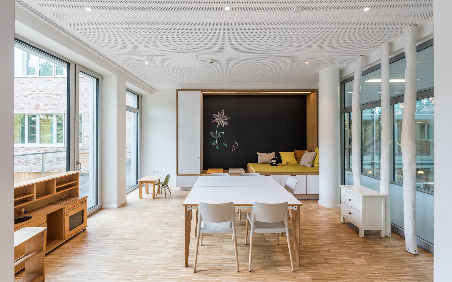Mit der neuen universitären Kinderklinik im UKE ist ein Haus entstanden, in dem sich alle bislang auf dem Campus verteilten pädiatrischen Stationen unter einem Dach zusammen finden. Die Klinik ist Lebensraum für Kinder und Erwachsene geworden für Patienten, Ärzte und Besucher mit einem hohem Anspruch an medizinische Funktionalität und besonderer Aufenthaltsqualität. Sie bildet den neuen Baustein im gewachsenen Ensemble des Universitätsklinikums Hamburg Eppendorf zwischen dem alten Baumbestand der Eichen und Buchen und einer kräftigen 126 jährigen Hainbuche, die mit ihrem Blätterdach Sinnbild für einen schützenden Ort ist und im Mittelpunkt des Eingangshofs des KinderUKE steht.