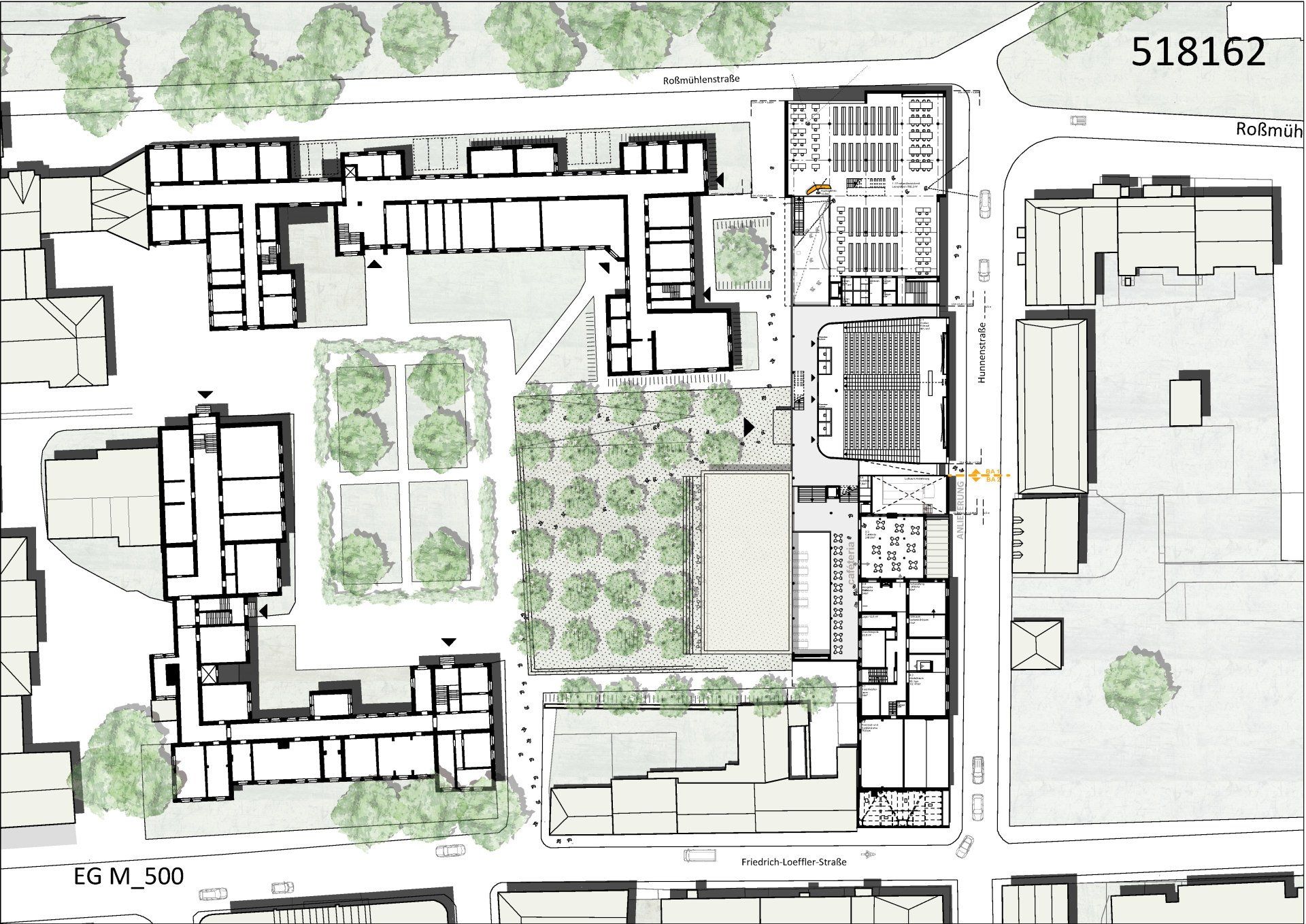 Unser Konzept schließt den Block an seinem nordöstlichen Rand und hält den Hof, das Herz des neuen Campus, frei von Gebäuden – als zentraler Ort der Kommunikation und Begegnung. Der neue, pavillonartige Speisesaal und das einer Orangerie ähnliche gemeinsame Foyer erhalten einen großzügigen Freiraum unter einem lichten Dach aus Kiefern.