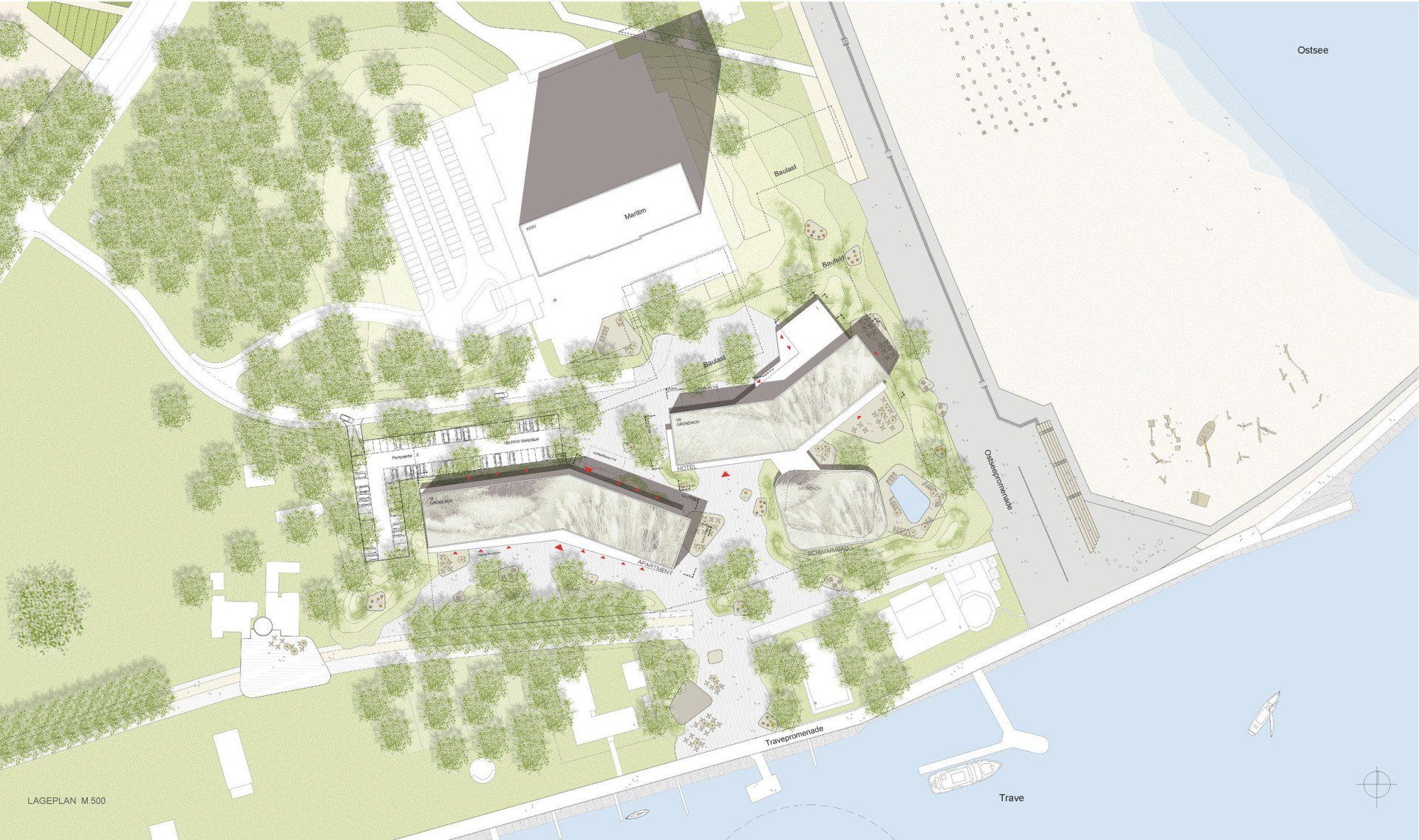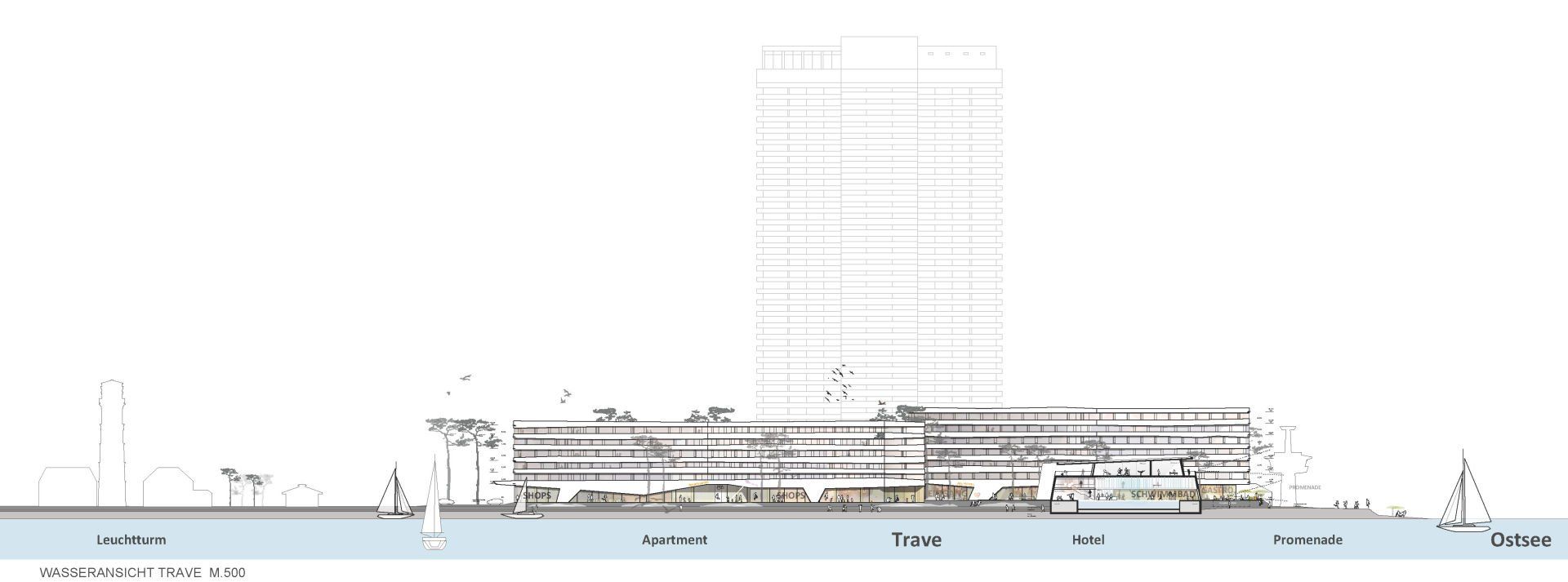 Die Deutsche Seereederei Hotel Holding plant den Bau eines neuartigen Ferien-Resorts in prominenter Lage zwischen Ostseestrand und Trave-Promenade. Das Ensemble aus Hotel, Appartements, Restaurant, Schwimmbad, SPA-Landschaft und Läden soll diesen Ort beleben und einem breiten Publikum zuführen.
