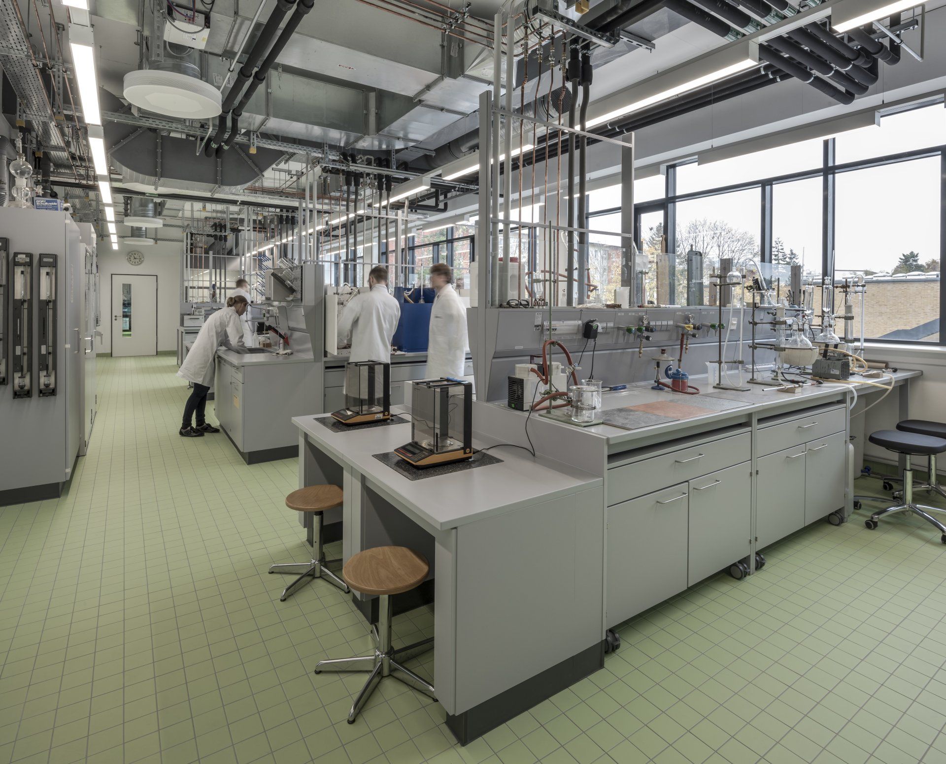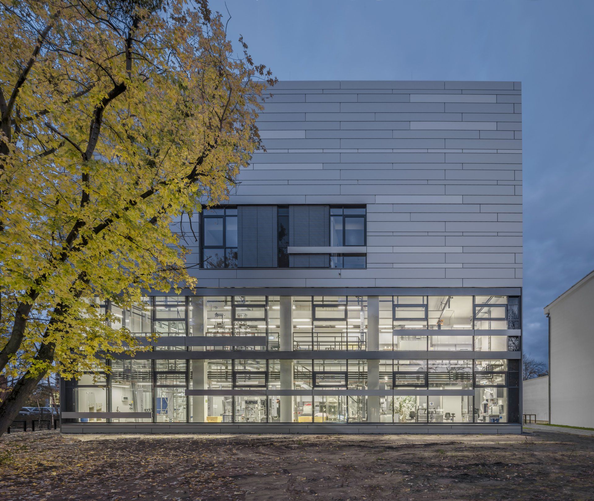 Konzeptionell gliedert sich das Gebäude der Länge nach in einen westlich gelegenen, hoch installierten Laborbereich und in einen östlich der Brandwand gelegenen niedriger installierten „Lowtech“-Bereich. So wird den sehr unterschiedlichen Anforderungen der Labornutzungen auf der einen Seite und den Büronutzungen und Lehrbereichen auf der anderen Seite Rechnung getragen und durch die Ausbildung von Raumzonen Synergie- und Einsparpotentiale in Fläche und technischer Ausstattung genutzt. Darüber hinaus bleiben für die Zukunft Wandlungsmöglichkeiten der Labore in Gebäudelängsrichtung erhalten.