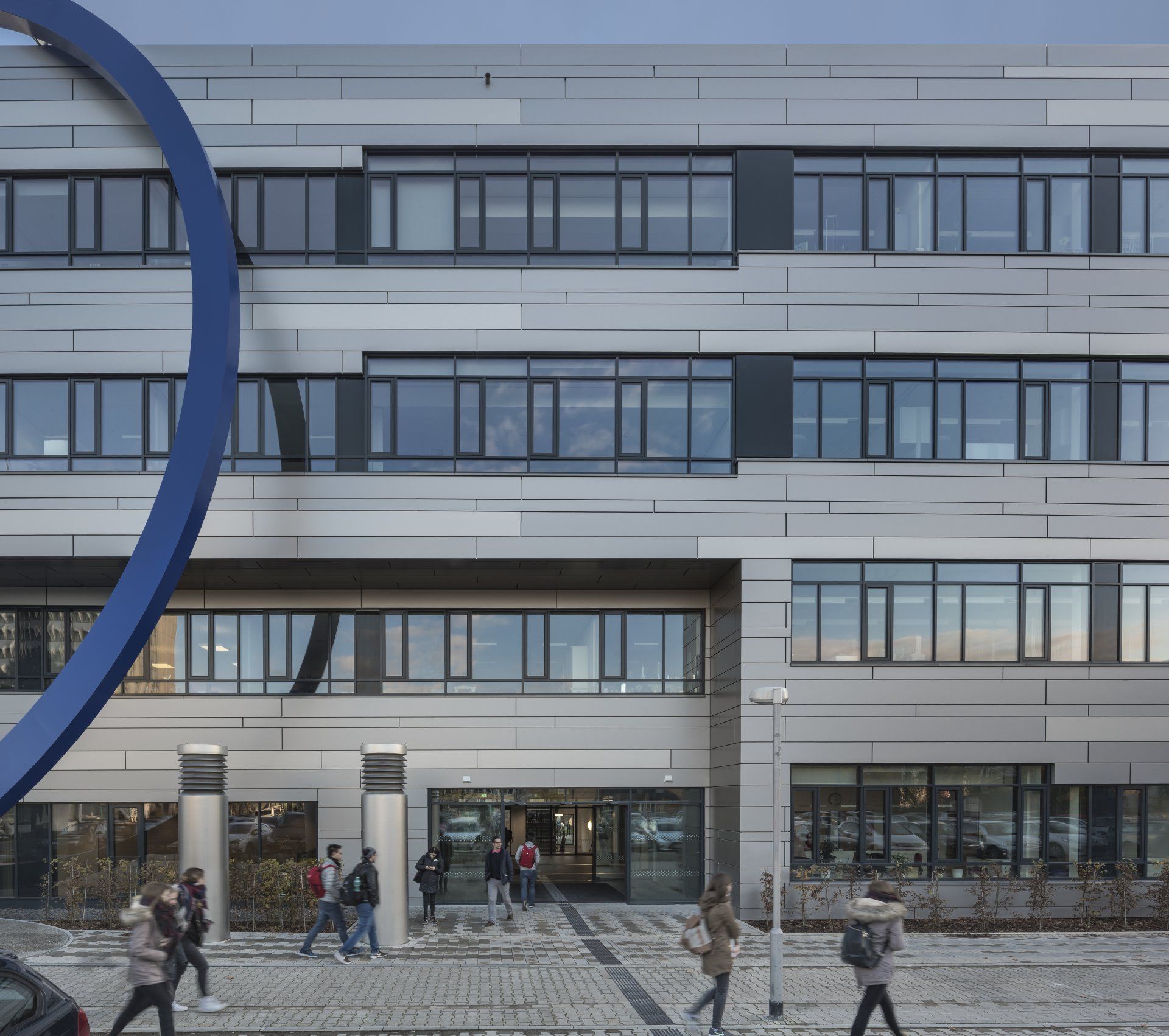 Die Aluminium-Fassade spielt mit der Umgebung und nimmt die Farbigkeit und Materialität des Hochhauses auf und steht gleichermaßen für den Anspruch der Hochschule in der Zukunft.