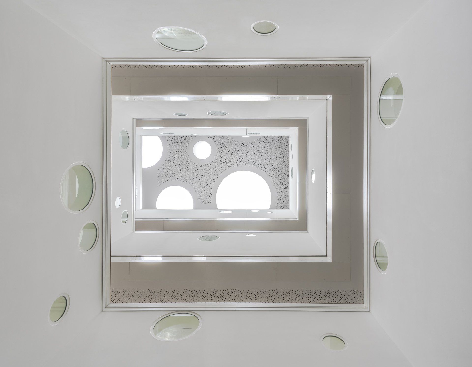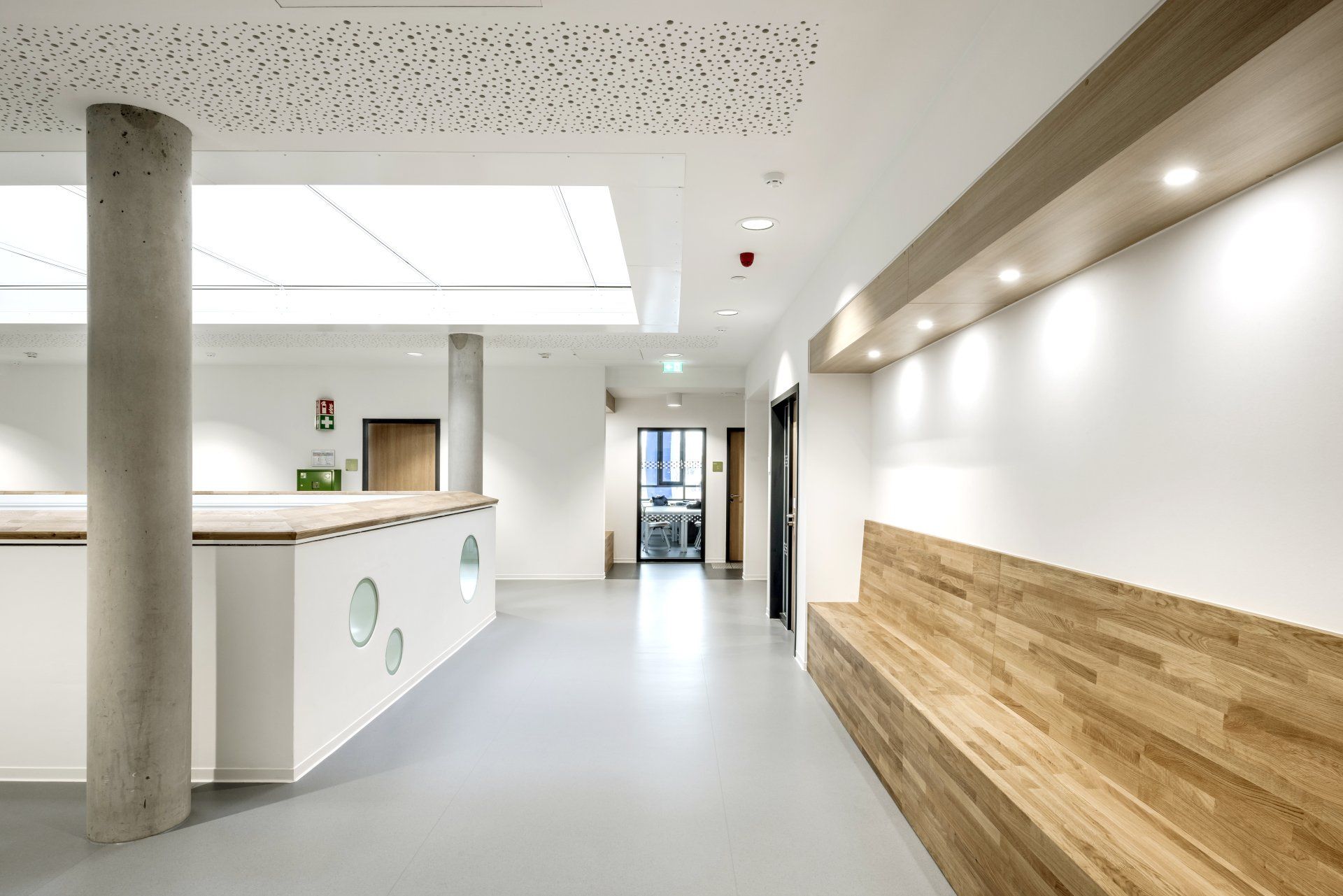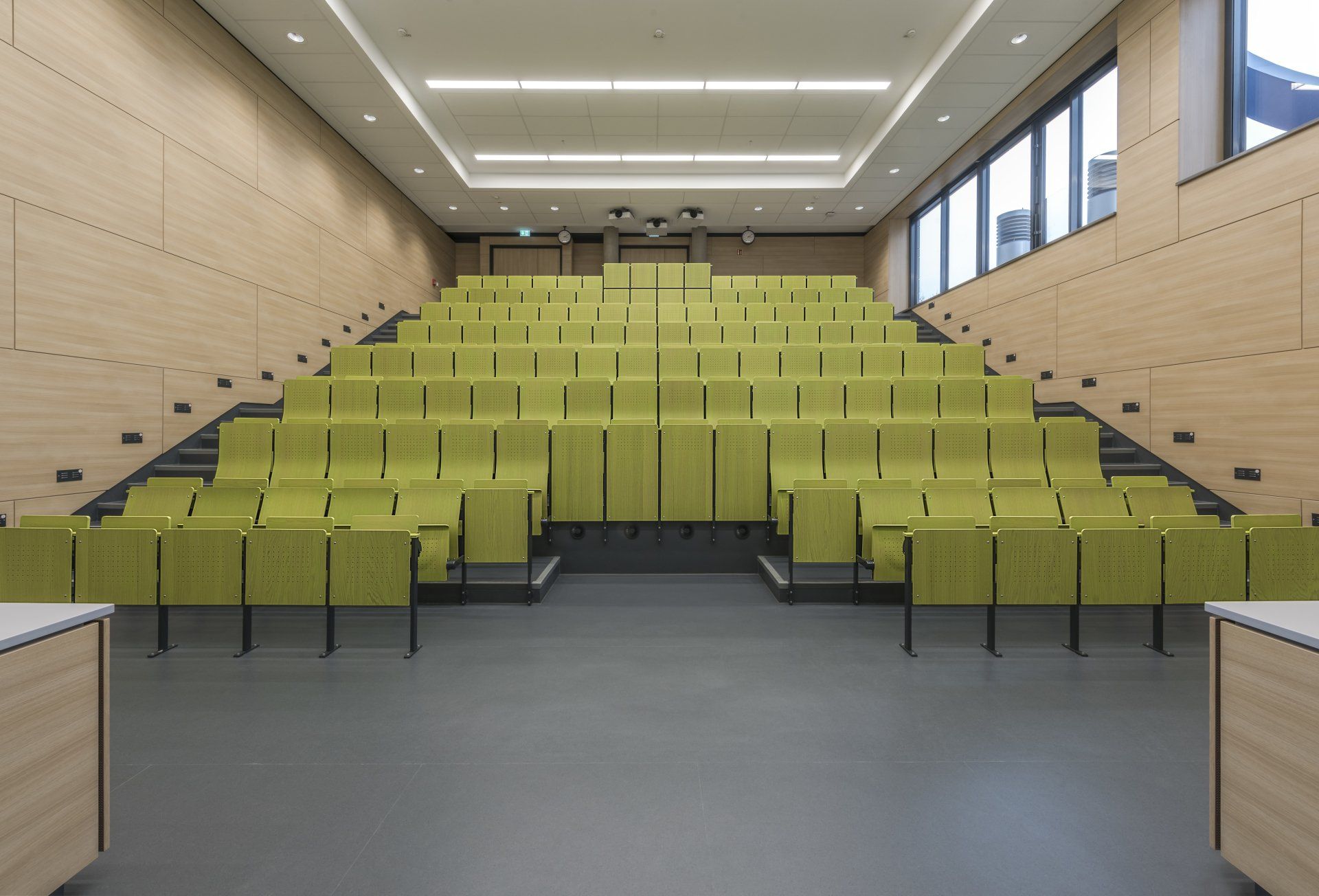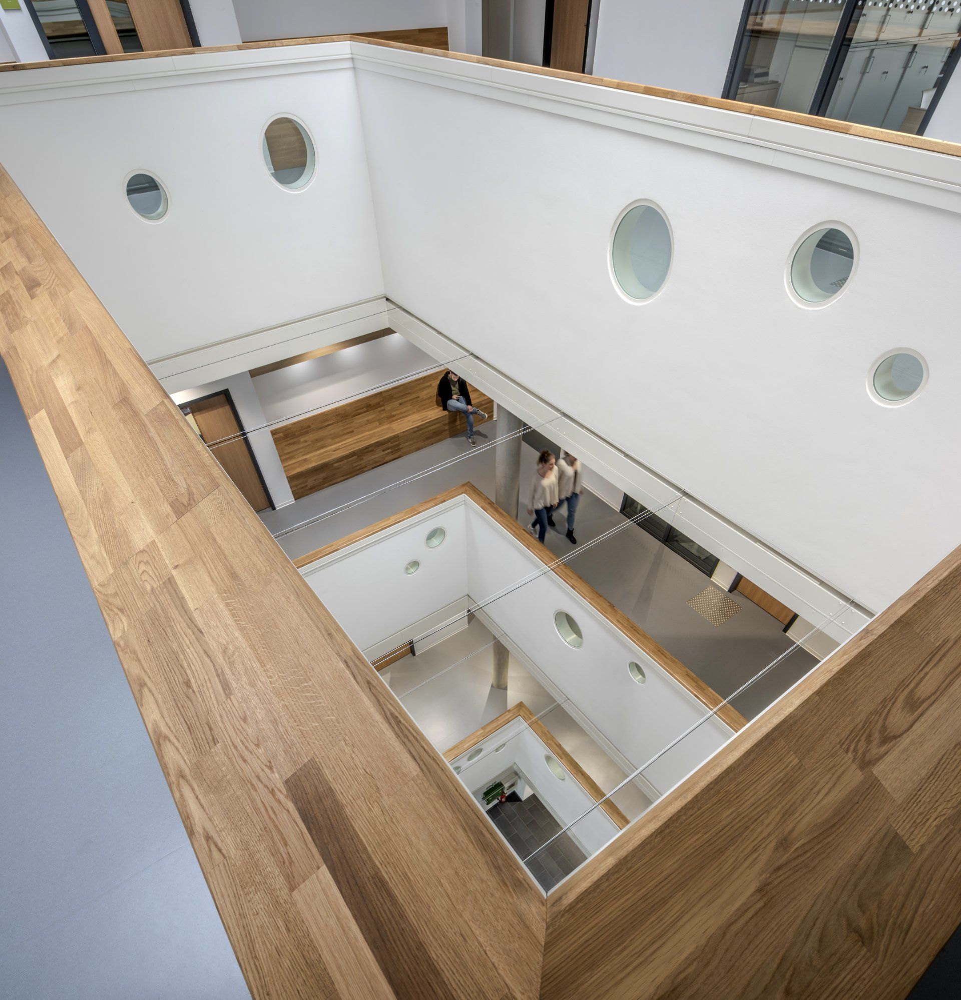 Das über alle vier Geschosse reichende Atrium ist Ort der spontanen, informellen Kommunikation und Dreh- und Angelpunkt des Lehrgebäudes. Die runden Öffnungen der Oberlichter ziehen sich durch alle Geschosse des Atriums und erwecken Assoziationen aufsteigender, blubbernder Gasblasen.