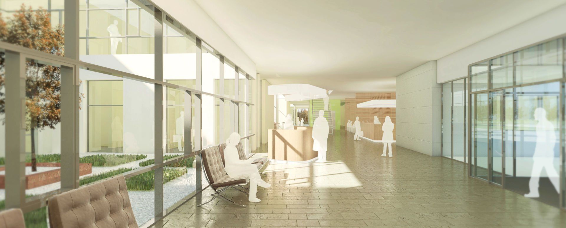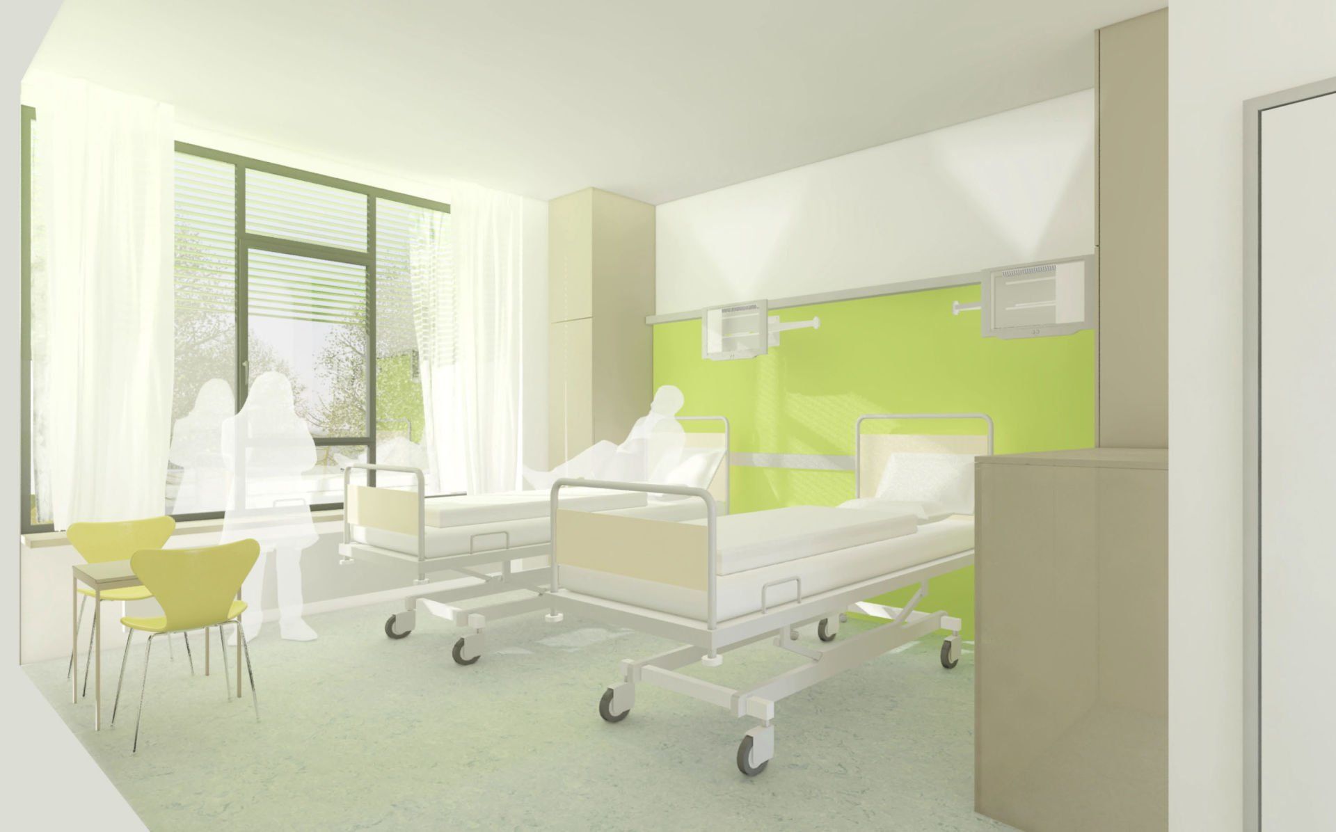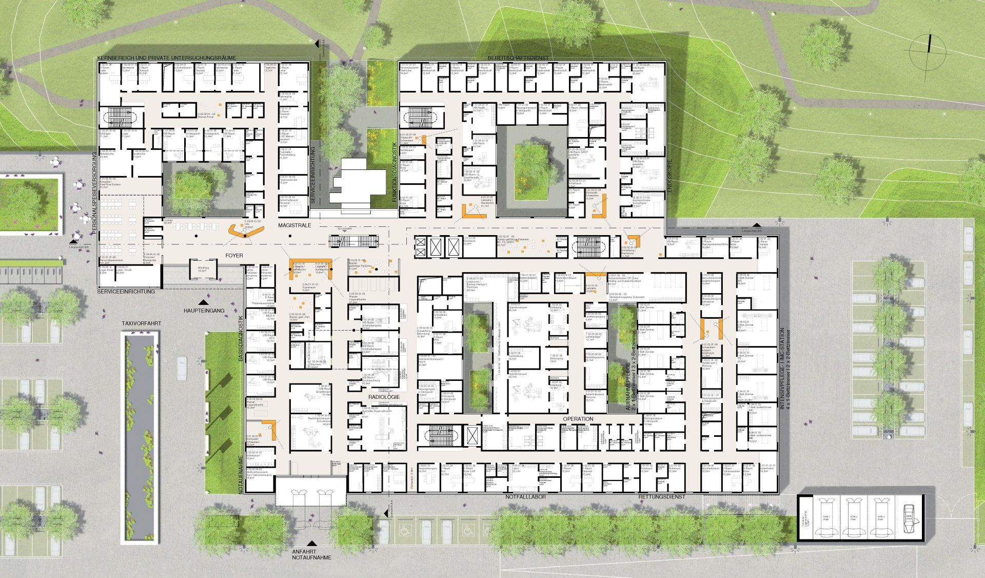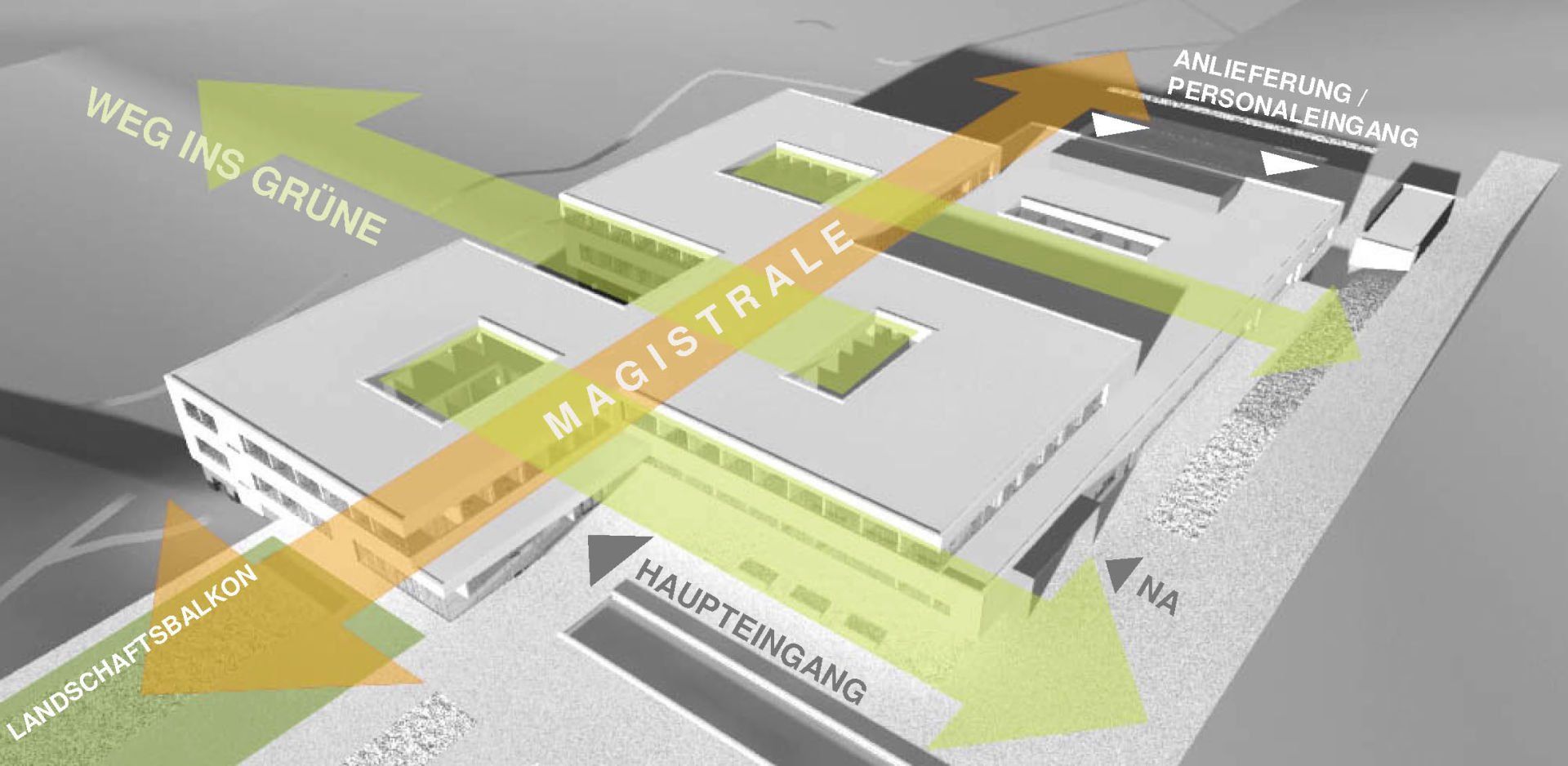 Er gliedert sich in ein Gartengeschoss, ein Funktionsgeschoss und ein Bettengeschoss. Das Erdgeschoss empfängt den Besucher an der zentralen Rezeption. Diese ist gleichzeitig der Ausgangspunkt für die Magistrale über die die Klinik erschlossen wird. Auf drei Ebenen trennt sie Besucher-, Patienten- sowie Ver- und Entsorgung und prägt so das Haus in seiner Grundstruktur. Die Pflegestation im Obergeschoss ist als Atriumstruktur ausgebildet. Die Stationen lagern sich mit ihren Funktionen um einen Innenhof. Alle Bettenzimmer sind nach außen zur Landschaft angeordnet.