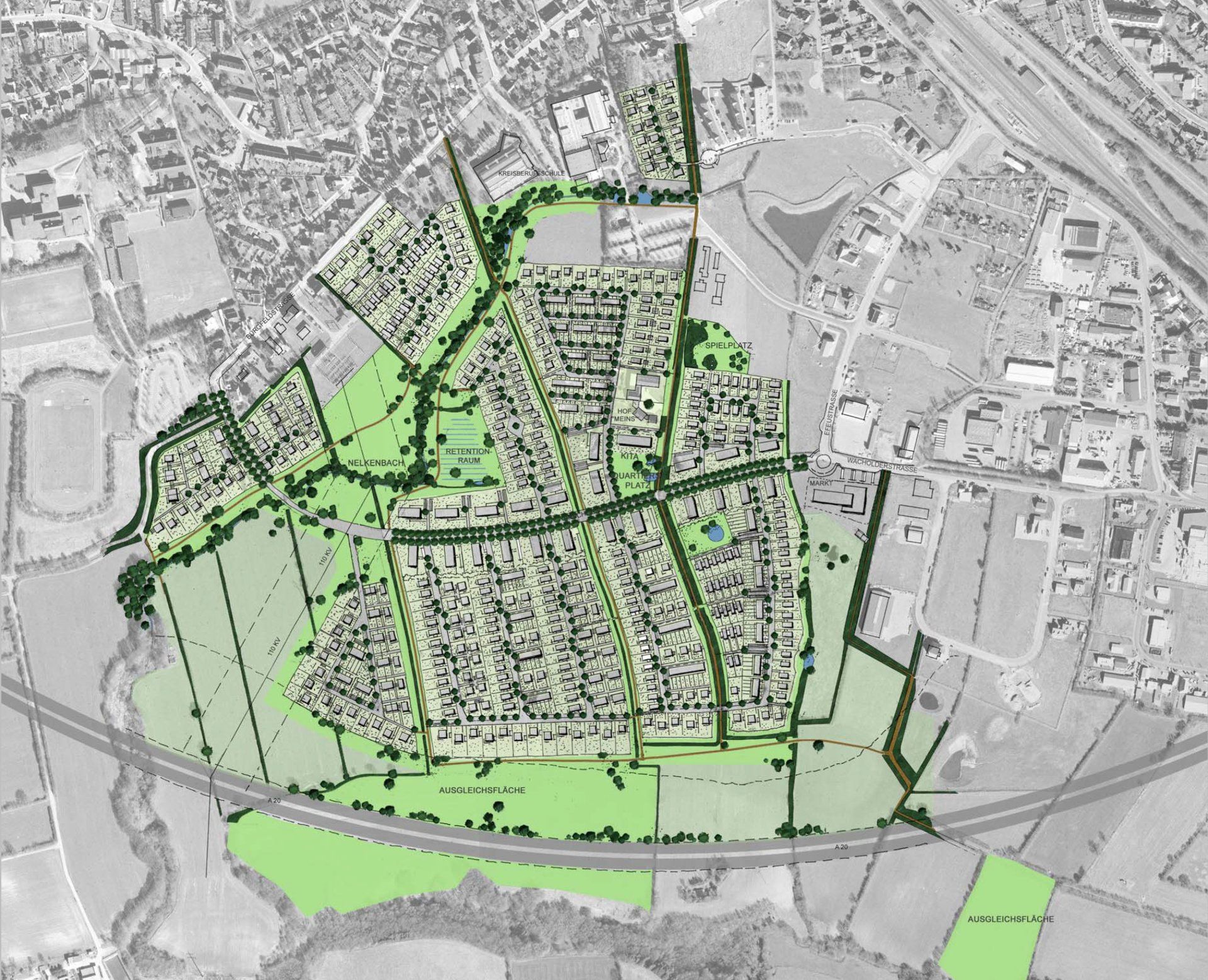 Im Planungsgebiet wird nur Wohnnutzung bis zu einem Abstand von ca. 150,00 m von der Autobahntrasse geplant. Die Aufteilung in Baufelder ermöglicht den Ausbau des Planungsgebietes in vier Bauabschnitten.