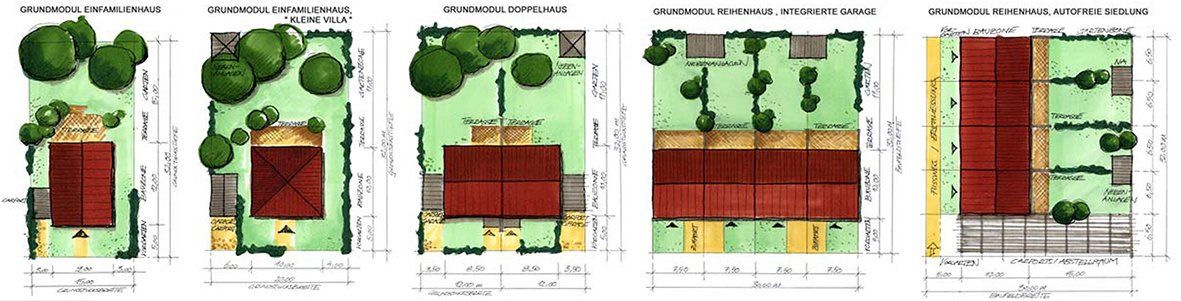 Zur Gestaltung des Baugebietes werden den einzelnen Baufeldern, die räumlich durch die bestehenden Grünstrukturen klar voneinander getrennt sind, unterschiedliche Bautypen zugeordnet. Auf diese Weise können in den Baufeldern unterschiedliche Dichten und durch Zuordnung von Bau-materialien unterschiedlich gestaltete Haustypen realisier werden, wobei eine einheitliche Gestaltung in den jeweiligen Baufeldern erzielt wird.