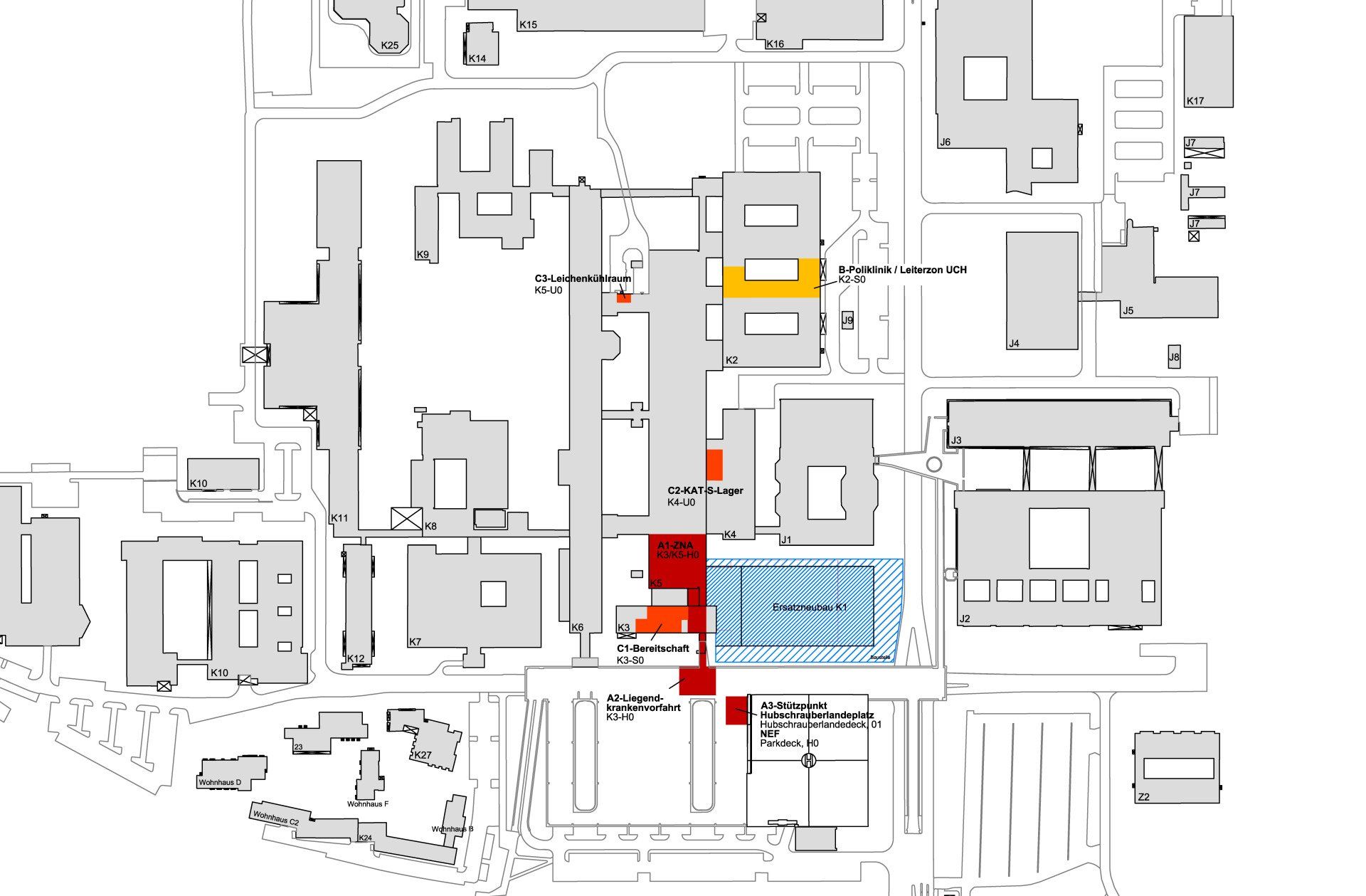 Hervorgegangen aus einem 2008 gewonnenen VOF-Verfahren plant tsj den Neubau der Zentralen Notaufnahme und angeschlossener zentraler Aufnahmestation, mit Operationssälen für die Abteilungen Unfallchirurgie und Plastische Hand- und Wiederherstellungschirurgie, Einrichtungen für die Katastrophenmedizin sowie einem Hubschrauberlandeplatz mit Luftrettungszentrum.