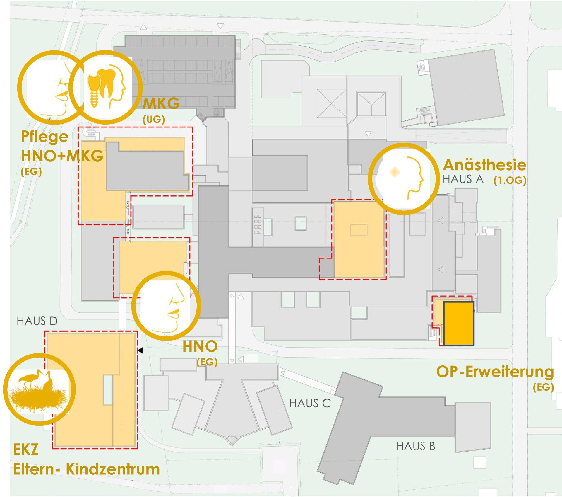 In Schritt 3+5 sind der Umbau und die Erweiterung von Haus A mit der Anästhesie, dem Klinischen Arztdienst sowie der Pflege HNO und MKG für die Umsetzung des „Eltern-Kind-Zentrum und Konzentration der OP-Abteilungen“ notwendig.
