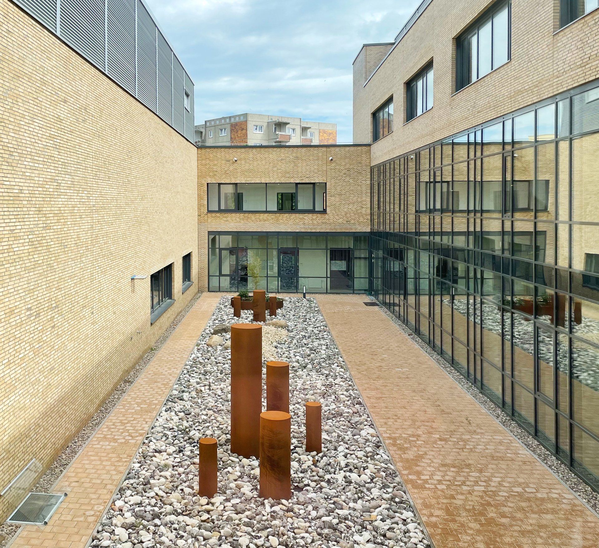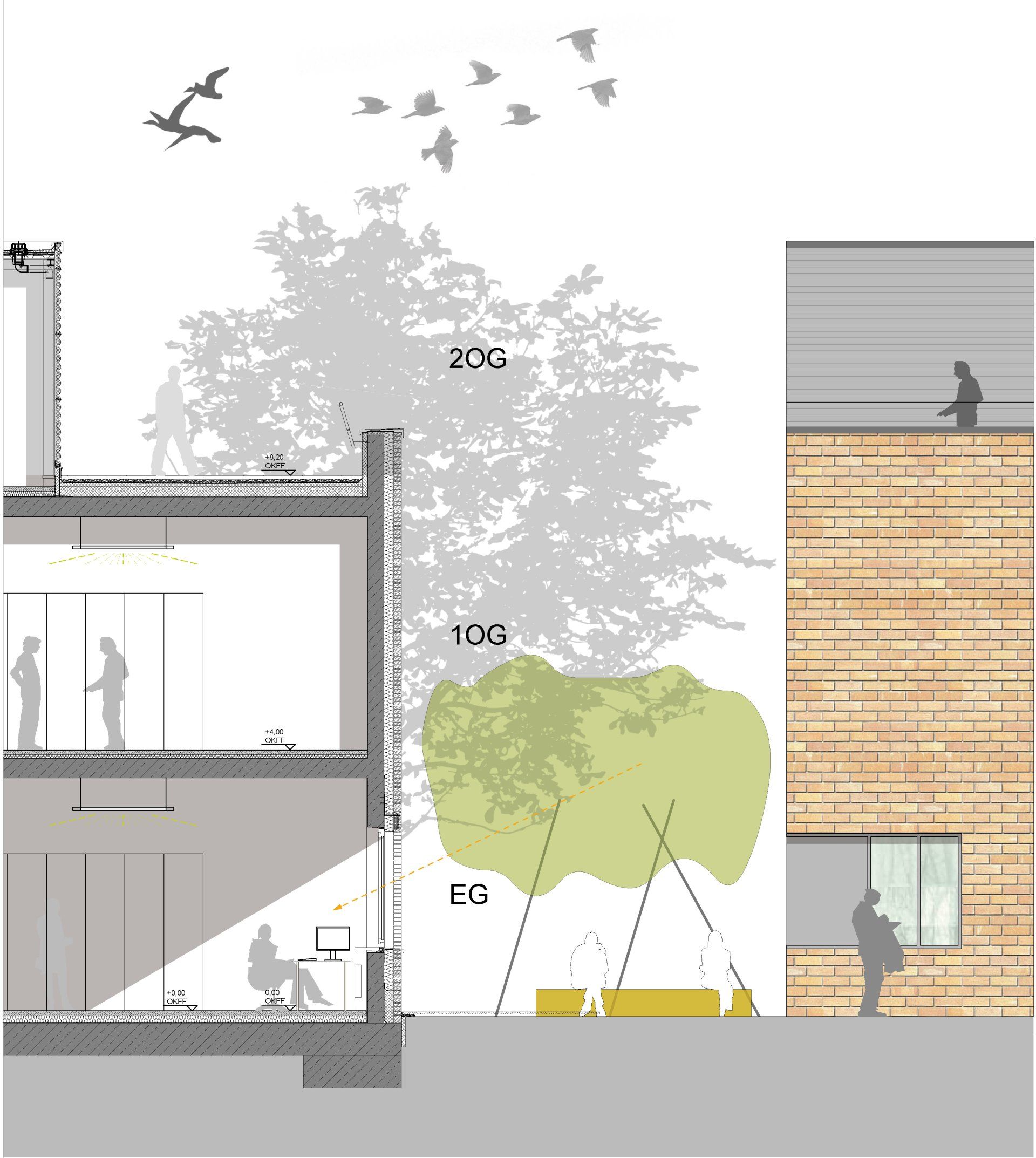 Die Gestalt des Gebäudes ist ein Abbild seiner inneren Struktur und Funktionalität. Diese sind bestimmt durch eine typologische, funktionale und technische Zonierung. Der Baukörper ist zweigeschossig mit einer Technikzentrale als Staffelgeschoss.