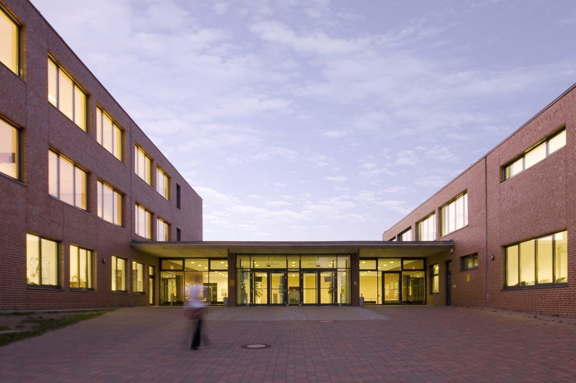 Die Verglasung der zu den Innenhöfen gelegenen Flurbereichen, erfolgt über vertikale, strukturierte Profilglaselemente, die eine klare Durchsicht verhindern und so der Unterricht in angrenzenden Klassen nicht gestört wird, aber dennoch die Flure großzügig mit Tageslicht versorgt werden. In diese Fassade sind Öffnungsflügel in Klarglas integriert, so dass Blickbeziehungen in die Höfe und die gegenüberliegenden Flure geschaffen werden.