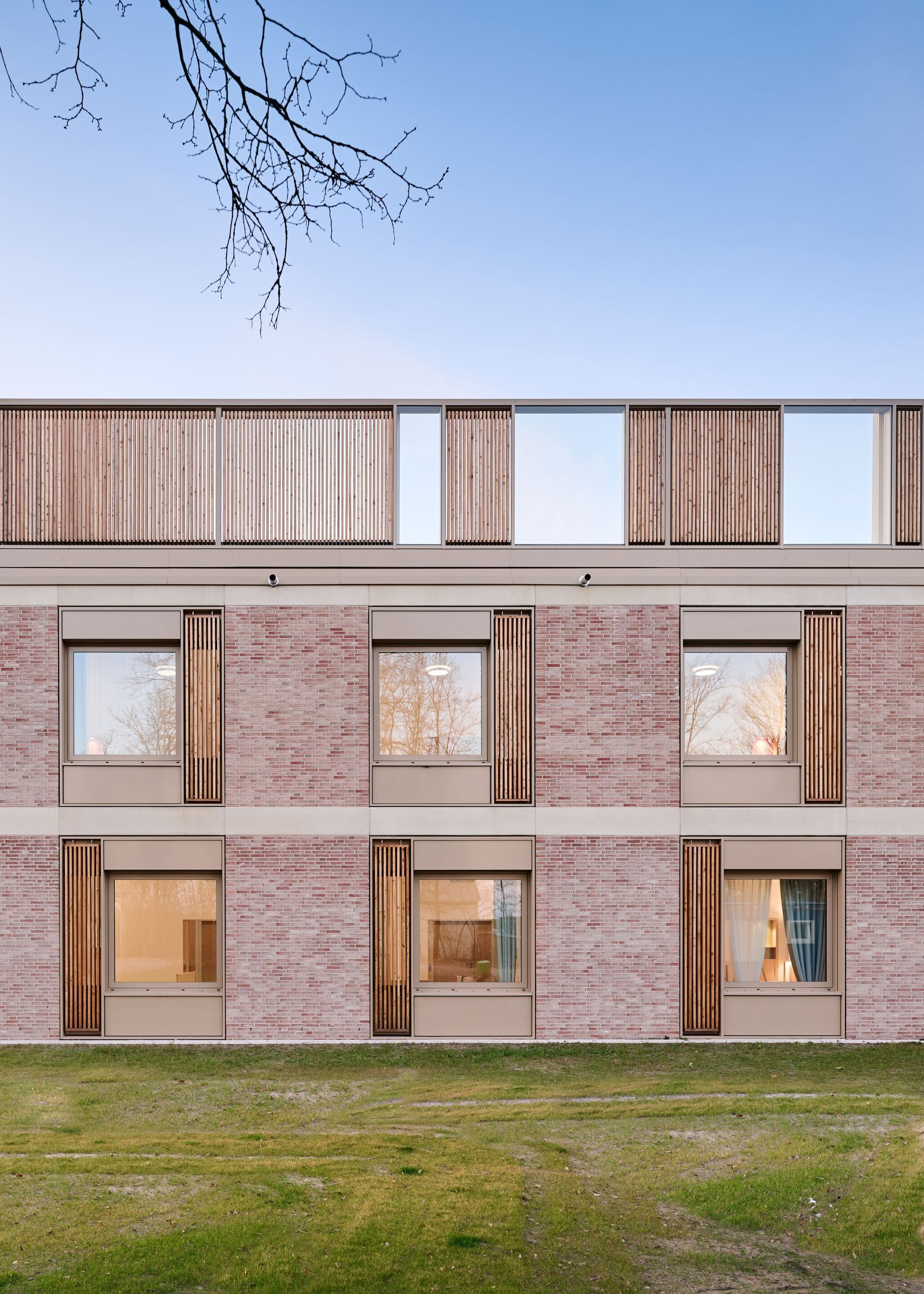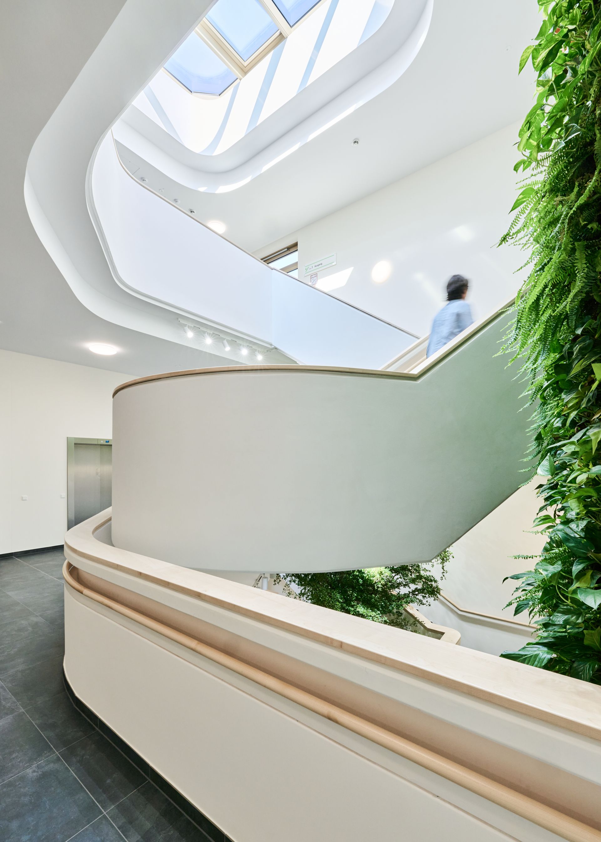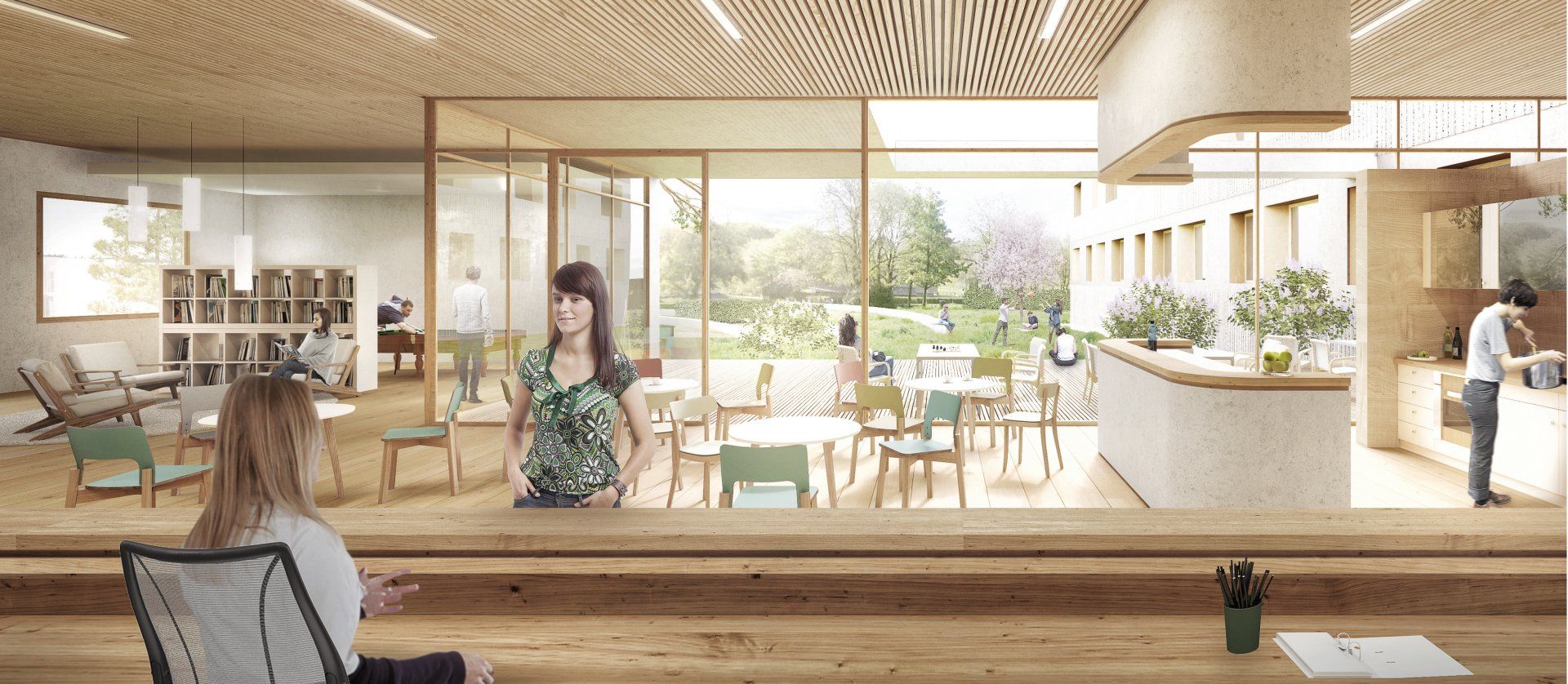 Durch die Gliederung des Bauvolumens in zwei verschränkte Häuser sind für Besucher und Patienten überschaubare Einheiten mit Identifikationspotential, sowie eine gute innere Orientierung gegeben. Alle Bettenzimmer sind nach außen, zum Park hin orientiert und bieten mit der naturbezogenen und wohnlichen Gestaltung ein heilungsförderndes Ambiente für den seelisch erkrankten Patienten.