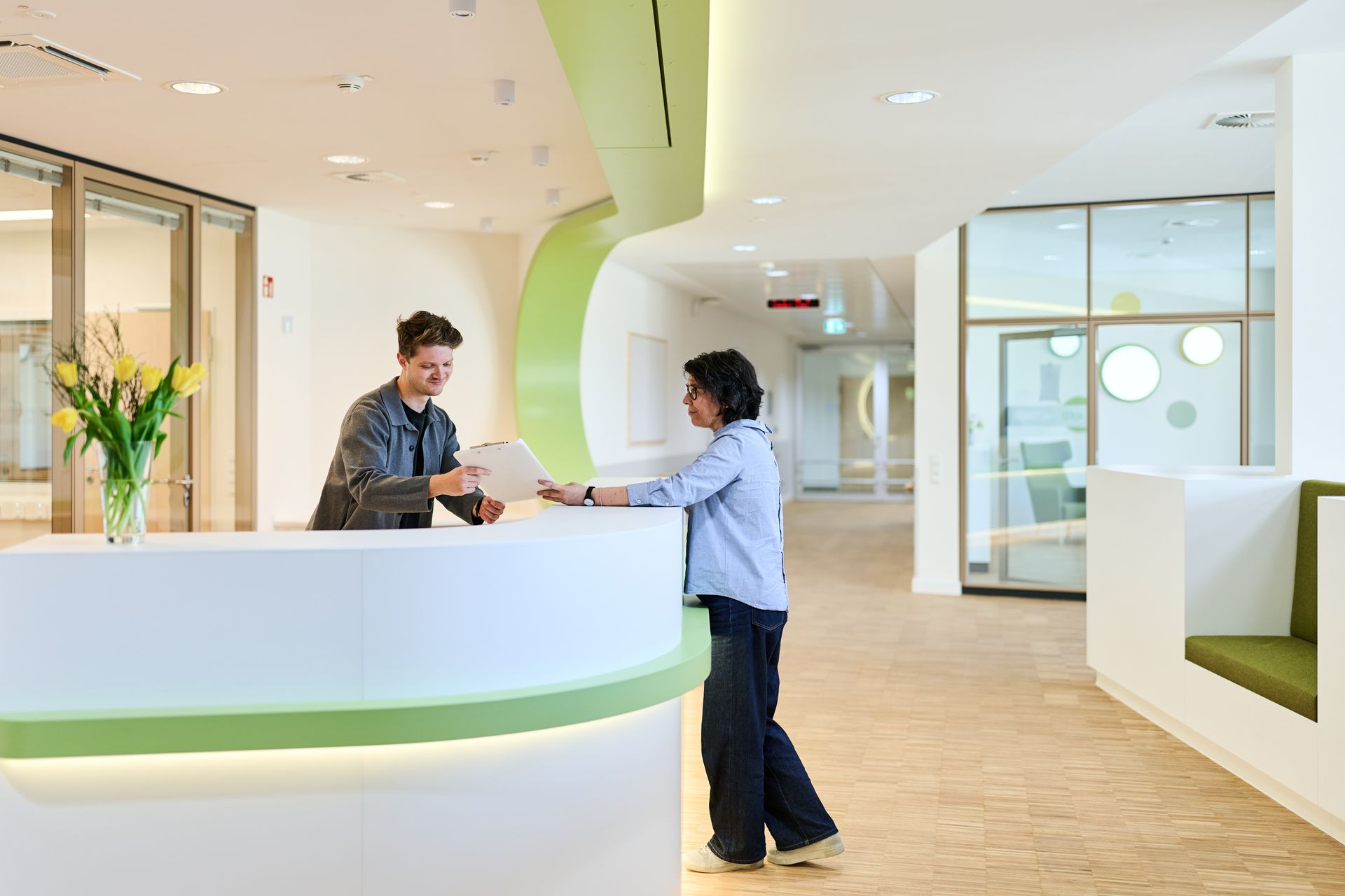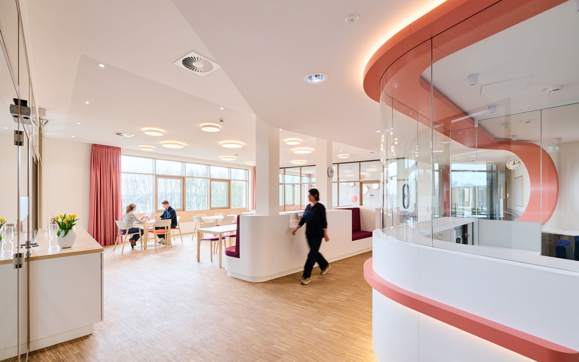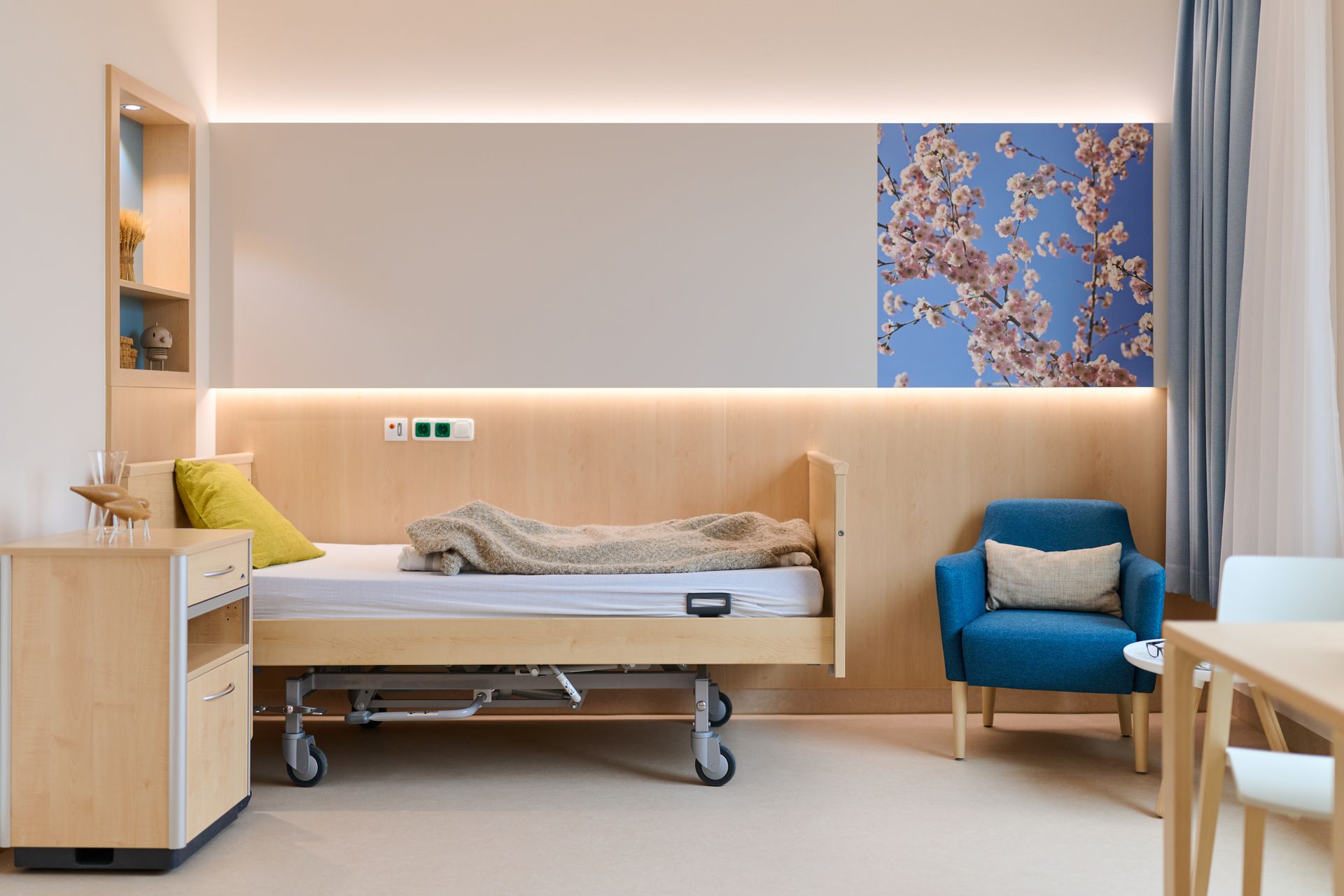 Durch die Gliederung des Bauvolumens in zwei verschränkte Häuser sind für Besucher und Patienten überschaubare Einheiten mit Identifikationspotential, sowie eine gute innere Orientierung gegeben. Alle Bettenzimmer sind nach außen, zum Park hin orientiert und bieten mit der naturbezogenen und wohnlichen Gestaltung ein heilungsförderndes Ambiente für den seelisch erkrankten Patienten.