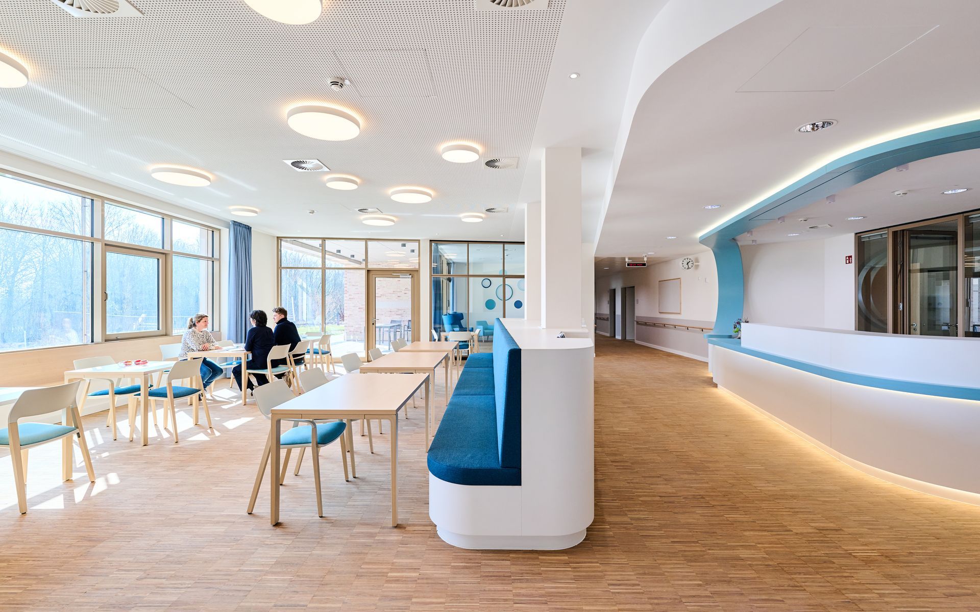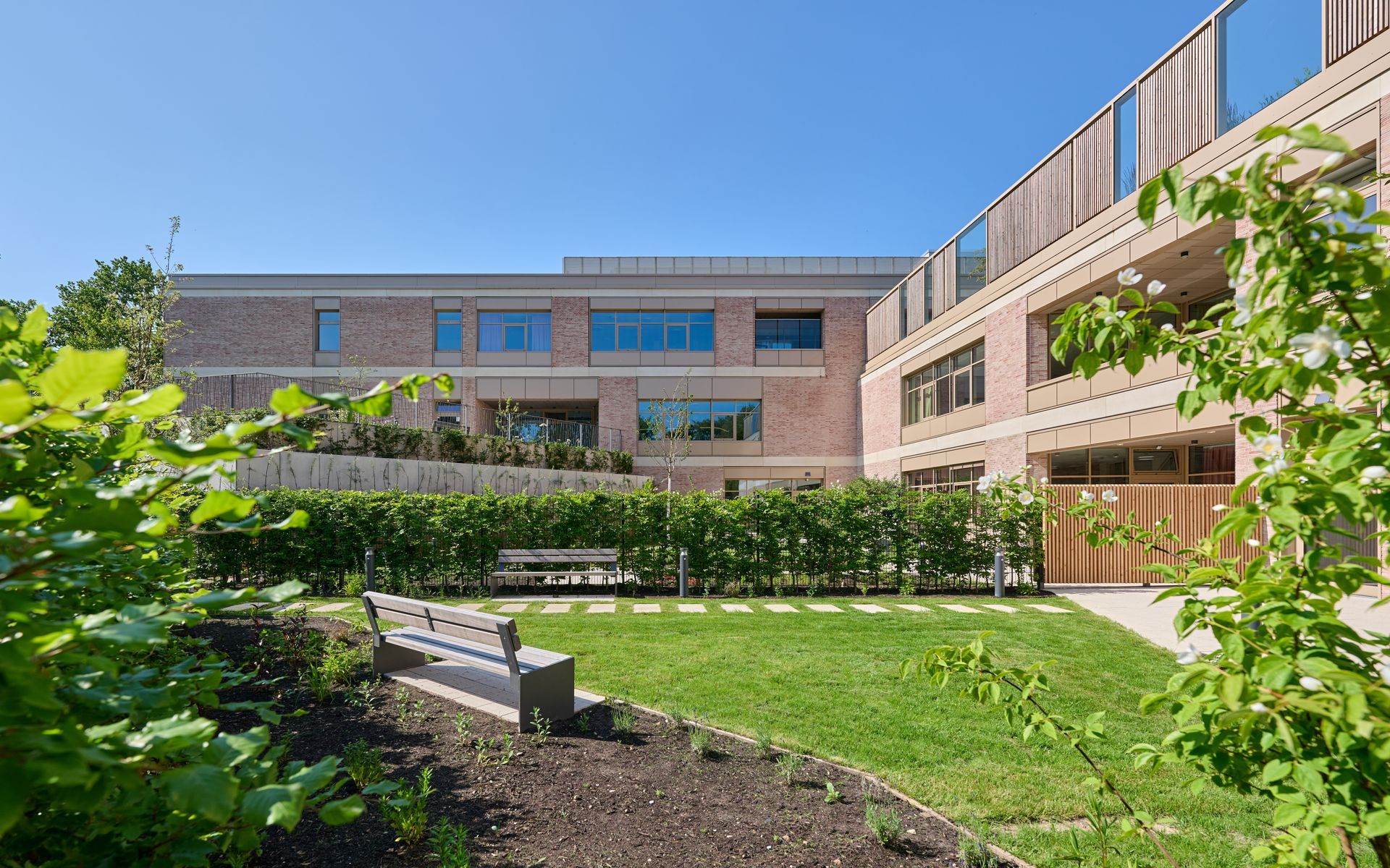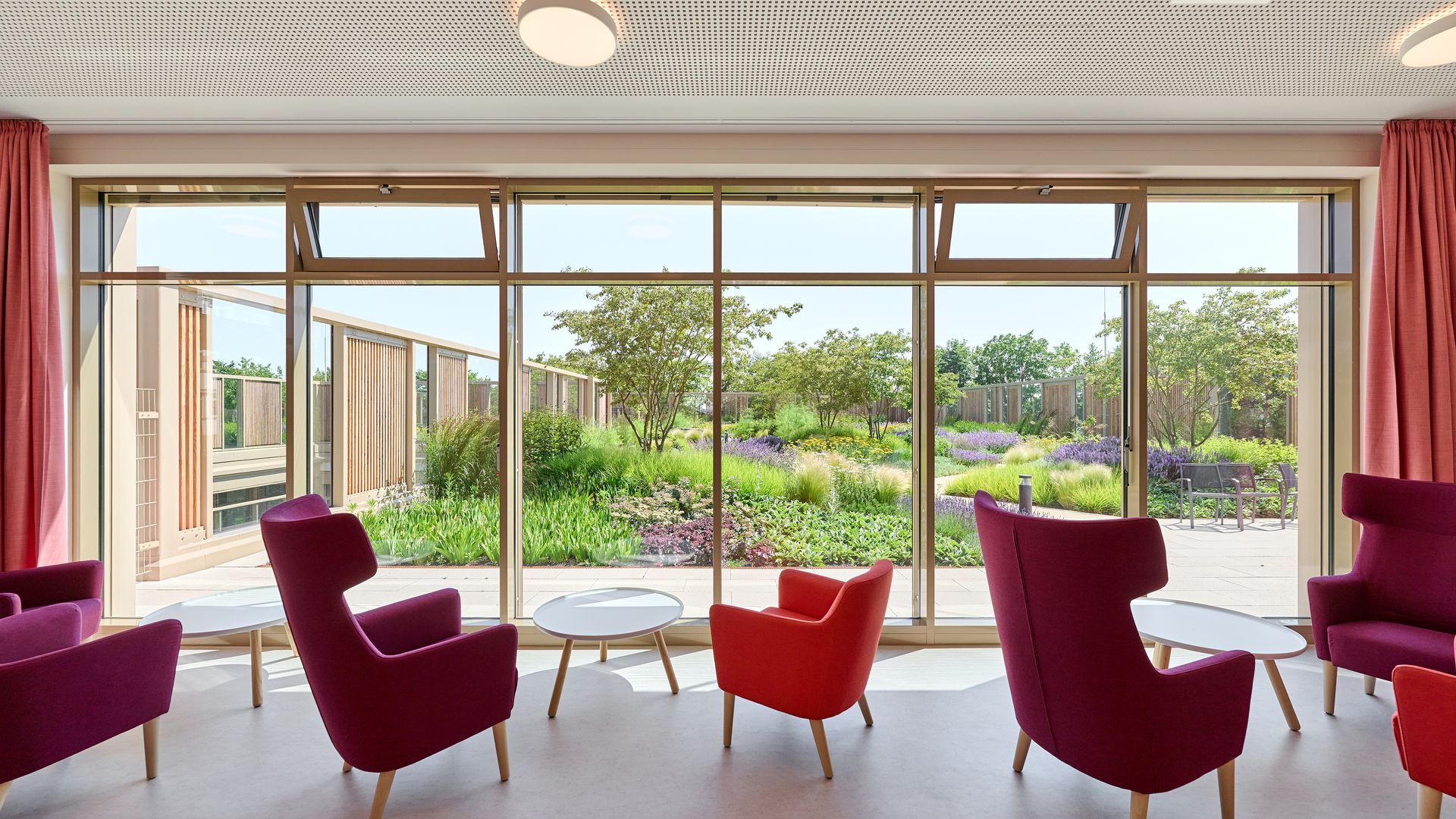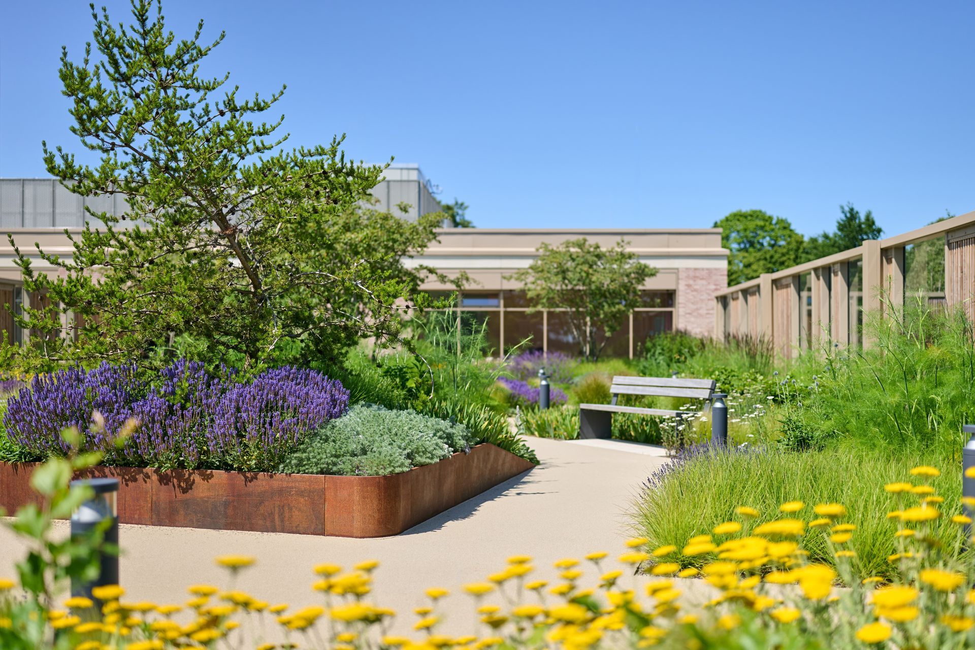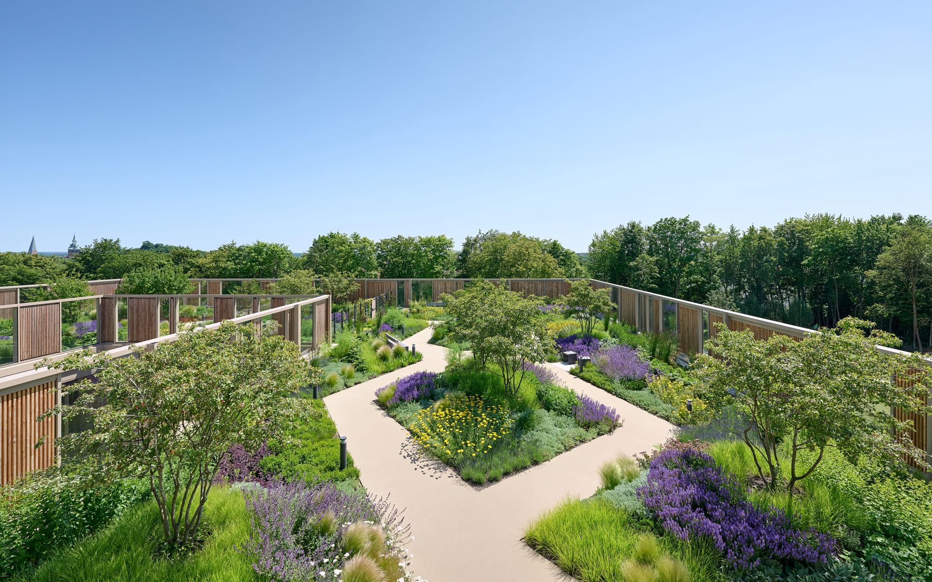 Der neu entstehende, weitläufige Dachgarten oberhalb der Erdgeschossebene ist von Norden, aus Richtung des denkmalgeschützten Landschaftsparks, über eine landschaftlich gestaltete Grünrampe zugänglich und steht Patienten, Besuchern und Personal zur Nutzung offen. Ein weiterer Zugang ist im Bereich der Cafeteria gegeben, wodurch sich die begrünten Dachflächen mit den Flächen des Landschaftsparks und dem südlich angrenzen Waldgarten der Stadt Lüneburg verknüpfen und Teil eines möglichen Rundlaufes durch die Grünanlagen werden.