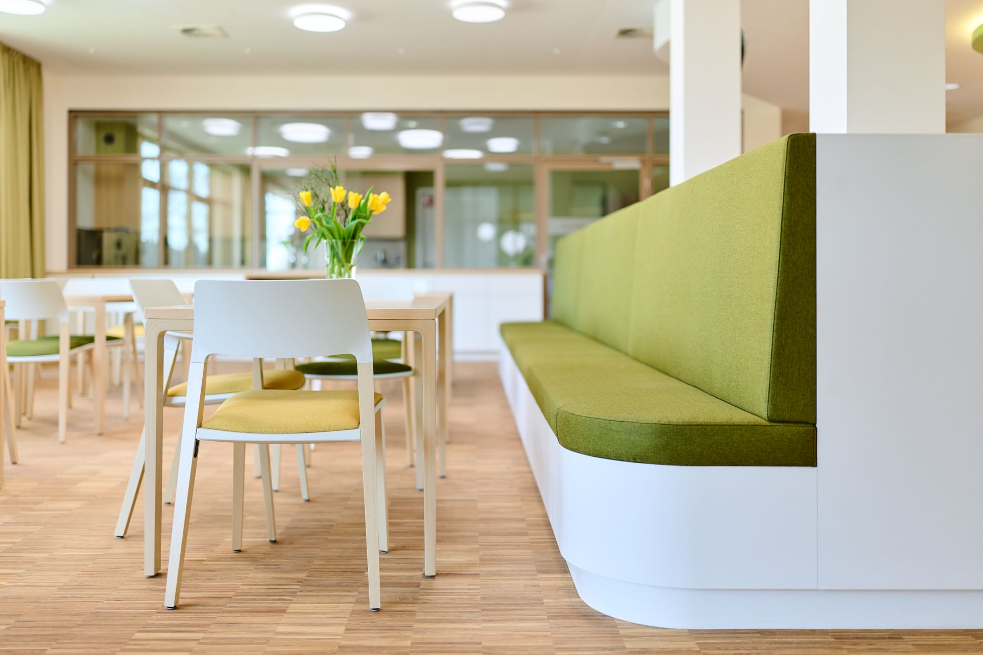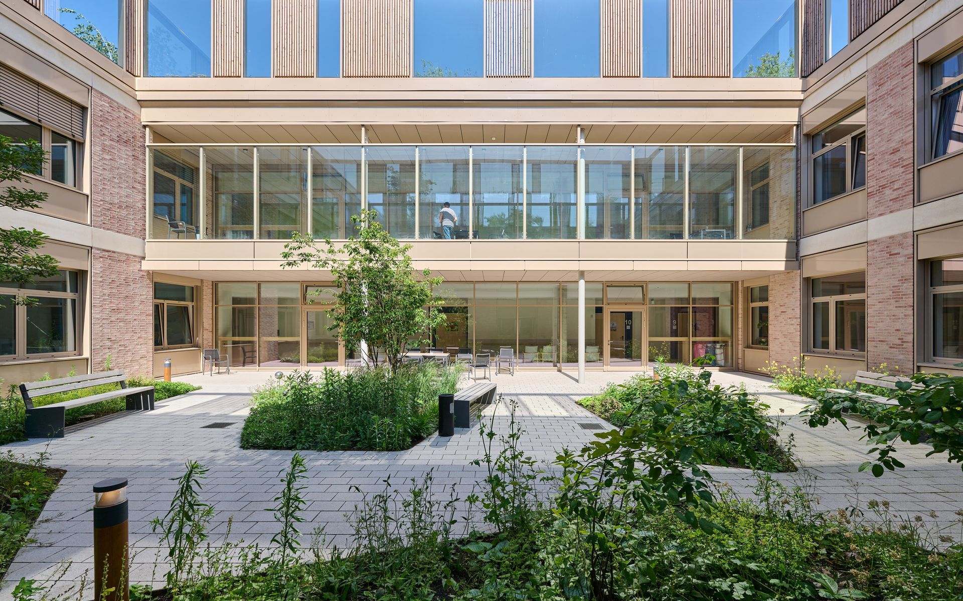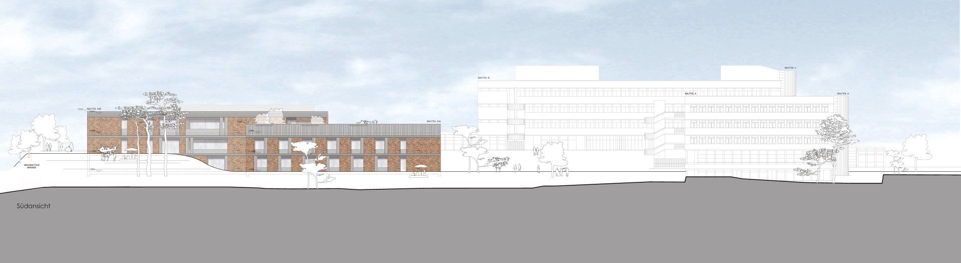 Die Kernnutzungen des Neubaus sind im 1.BA vier modular aufgebaute Pflegestationen, von denen zwei zukünftig als Gerontopsychiatrische Stationen geführt werden. Jede Station ist als Atriumhaus um einen Innenhof organisiert und bietet einen abwechslungsreichen Rundlauf innerhalb des Baukörpers.