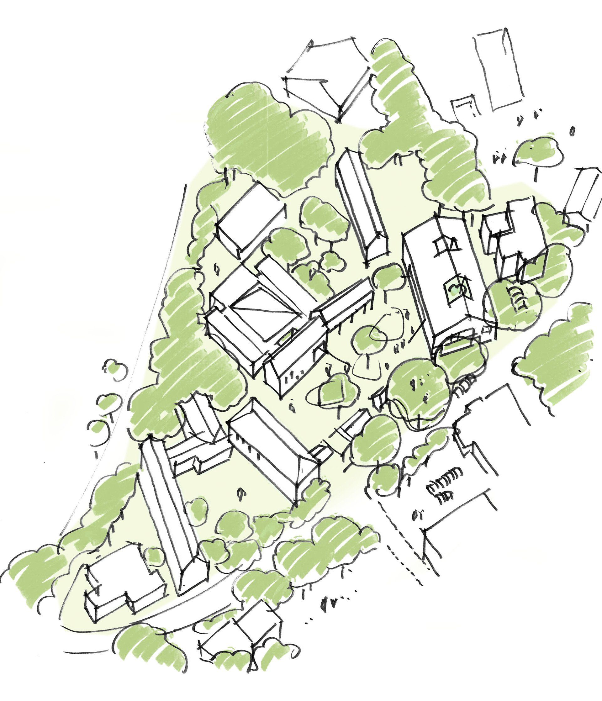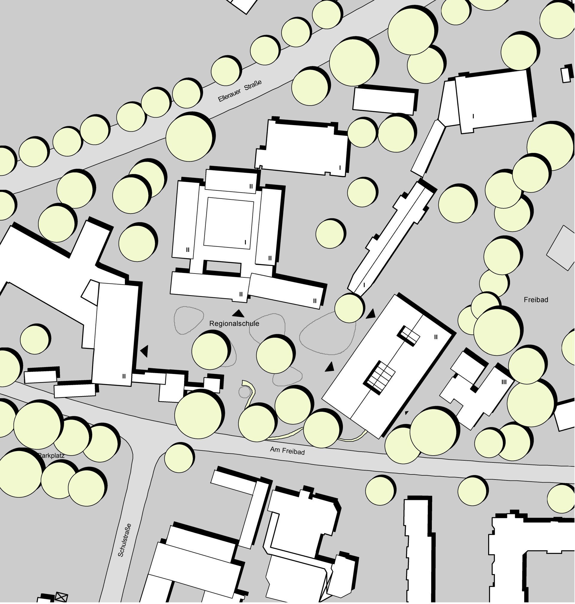 Unser Entwurf für das neue Schulgebäude fügt sich als freistehendes Haus fächerartig in das Schulensemble ein. Als kompakter zweigeschossiger Baukörper greift er die äußeren und inneren Wegebeziehungen auf und verbindet die Bestandsgebäude miteinander. In der Mitte des Hauses befindet sich das Atrium, um das sich die unterschiedlichen Nutzungen gruppieren. Es bildet die Mitte des neuen Hauses, es verbindet die Geschosse miteinander und wird so wichtiger Schwerpunkt und Treffpunkt im Schulalltag.