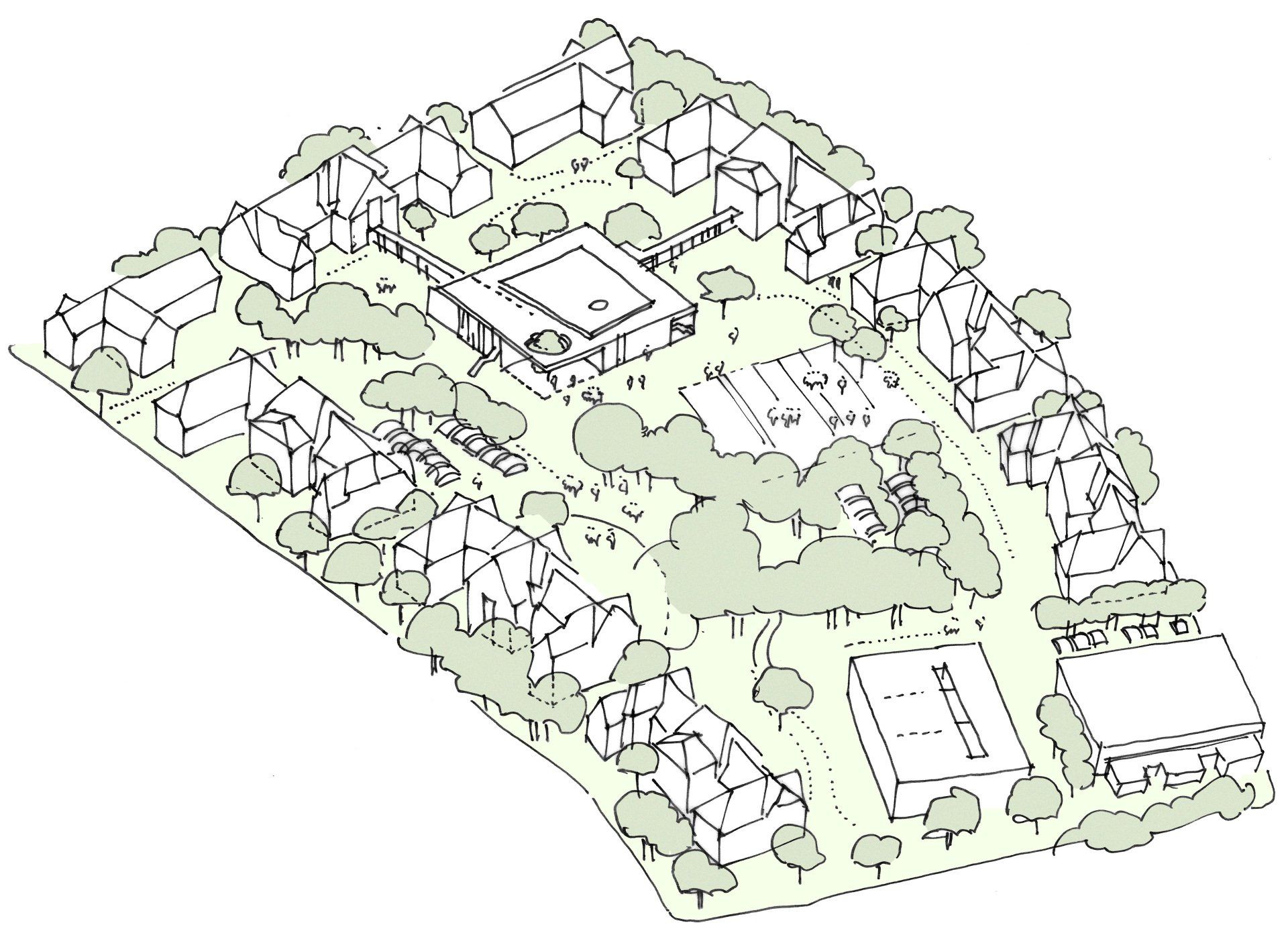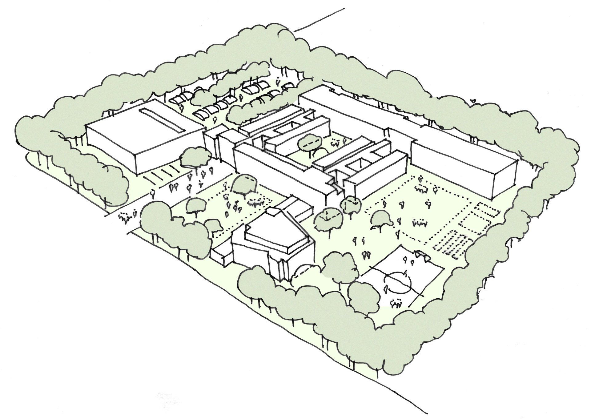 Ein zweigeteilter, dreigeschossiger Riegel im Nordosten des Bestandsgebäudes sowie die zweigeschossige Sporthalle im Südwesten nehmen die Pavillonstruktur auf und gewährleisten ein Gleichgewicht der Baumassen der Gesamtanlage. Durch die Anordnung der neuen Baukörper werden im Zusammenspiel mit dem Bestand drei außen liegende Höfe sowie ein zentraler Innenhof definiert, denen jeweils eine Funktion, entsprechend ihrer Lage zugeordnet wird.