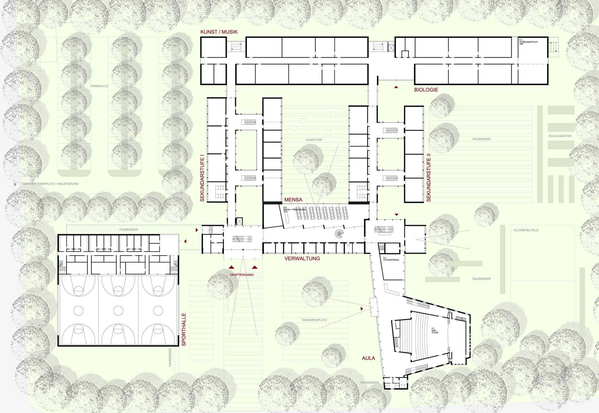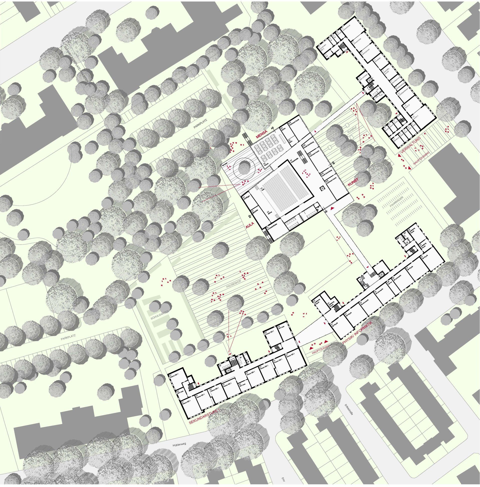 Die Verteilung der Funktionen ist so geplant, dass die übergeordnetenBereiche, wie Aula, Mensa, Pausenraum und Fachräume zentral im Neubau und dem Haus 63 untergebracht werden, während die Unterrichtsräume der Sekundarstufe 1 und 2 jeweils in den beiden peripheren Häusern liegen.