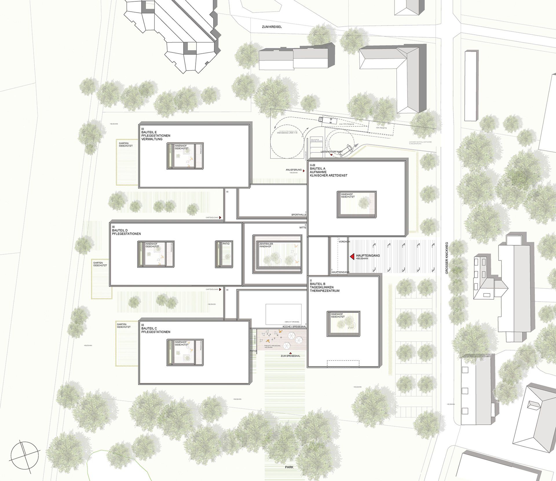 Als eigenständiges kleines Dorf innerhalb des Klinikdorfes Köthenwald gruppieren sich die fünf Häuser des neuen Klinikums um eine gemeinsame Mitte und bilden eine maßstäbliche und überschaubare Einheit. Dieses "Zuhause auf Zeit" ist ein anregendes Gebäude mit einem heilungsfördernden Umfeld für Körper, Geist und Seele, das den unterschiedlichen Bedürfnissen seiner Bewohner entspricht. Individuelle Rückzugsorte und differenzierte Räume mit unterschiedlichen Abstufungen von Privatheit und Öffentlichkeit, in denen verschiedenste soziale Interaktionen sowie eine individuelle Therapie- und Freizeitgestaltung möglich sind, tragen dazu bei, dass das Gebäude nicht als Krankenhausmaschine empfunden wird, sondern als liebevolle Hinwendung zu seinen Gästen.